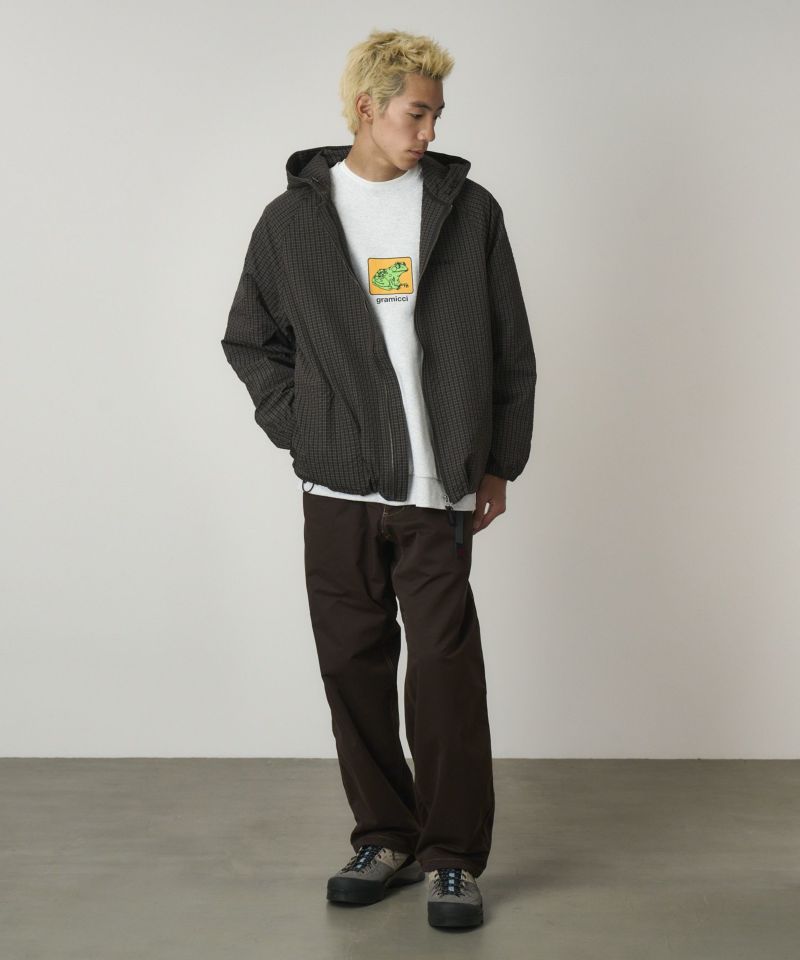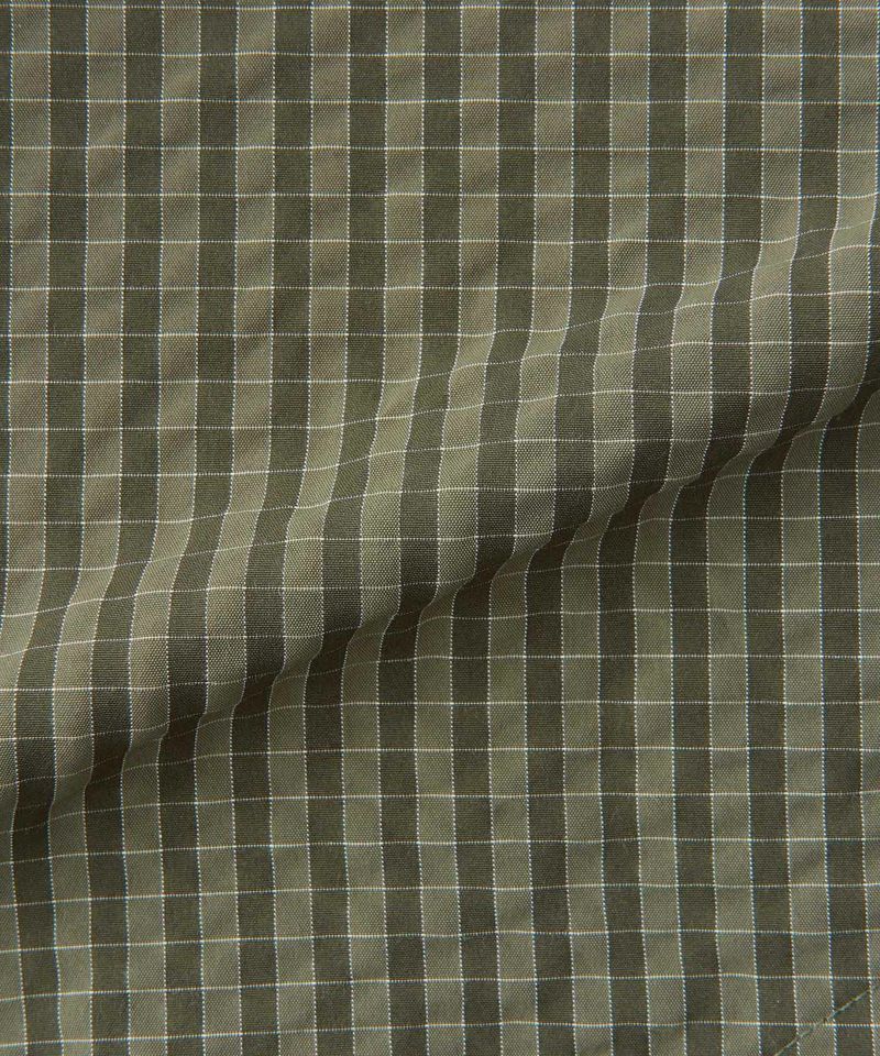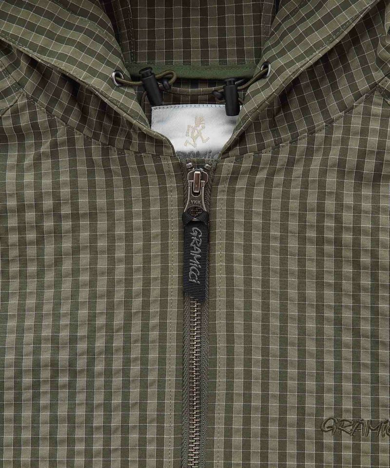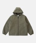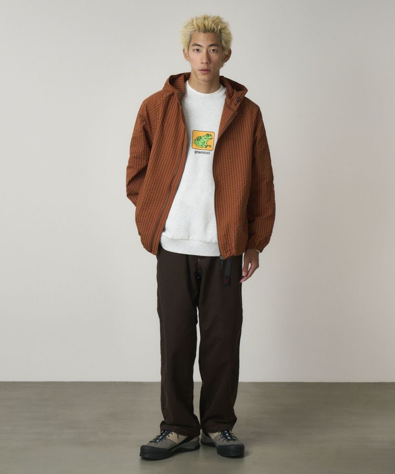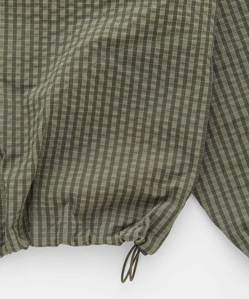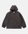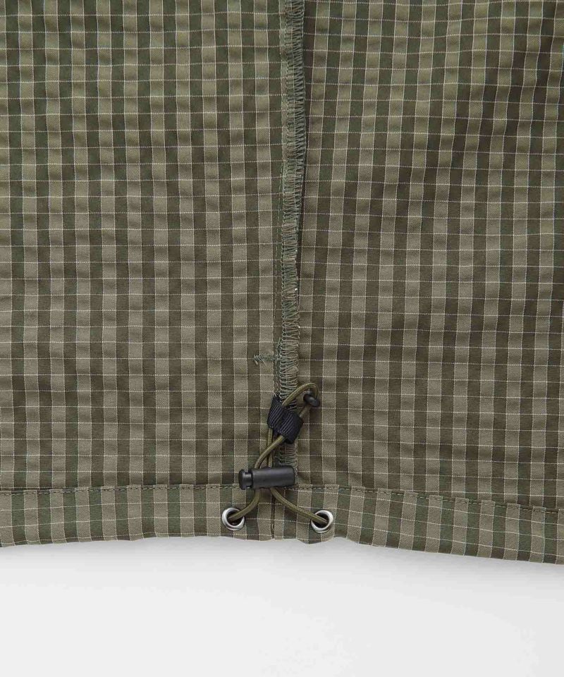 ラグランスリーブのフーデッドジャケットは、特性が異なる2種類の糸を用いて織機し、染色からくる縮率の差によって生地表面に独特の凹凸がある、シアサッカー調のユニークな素材を使用しています。独特のハリ感があり、軽撥水性も持ち合わせています。