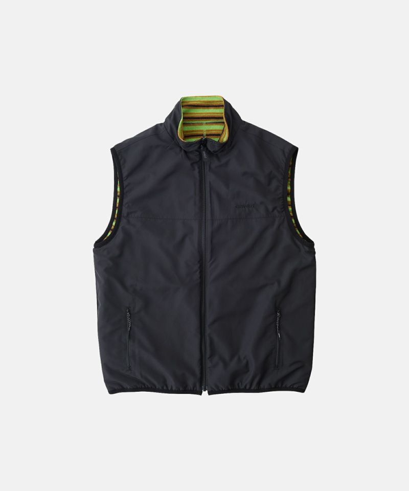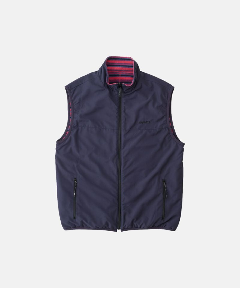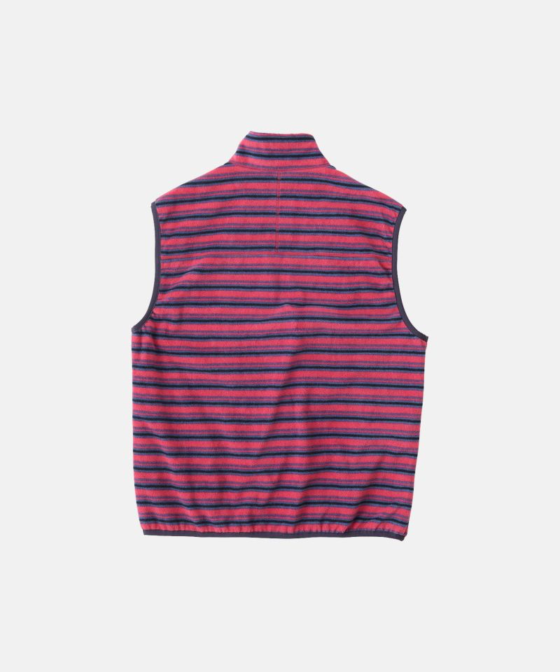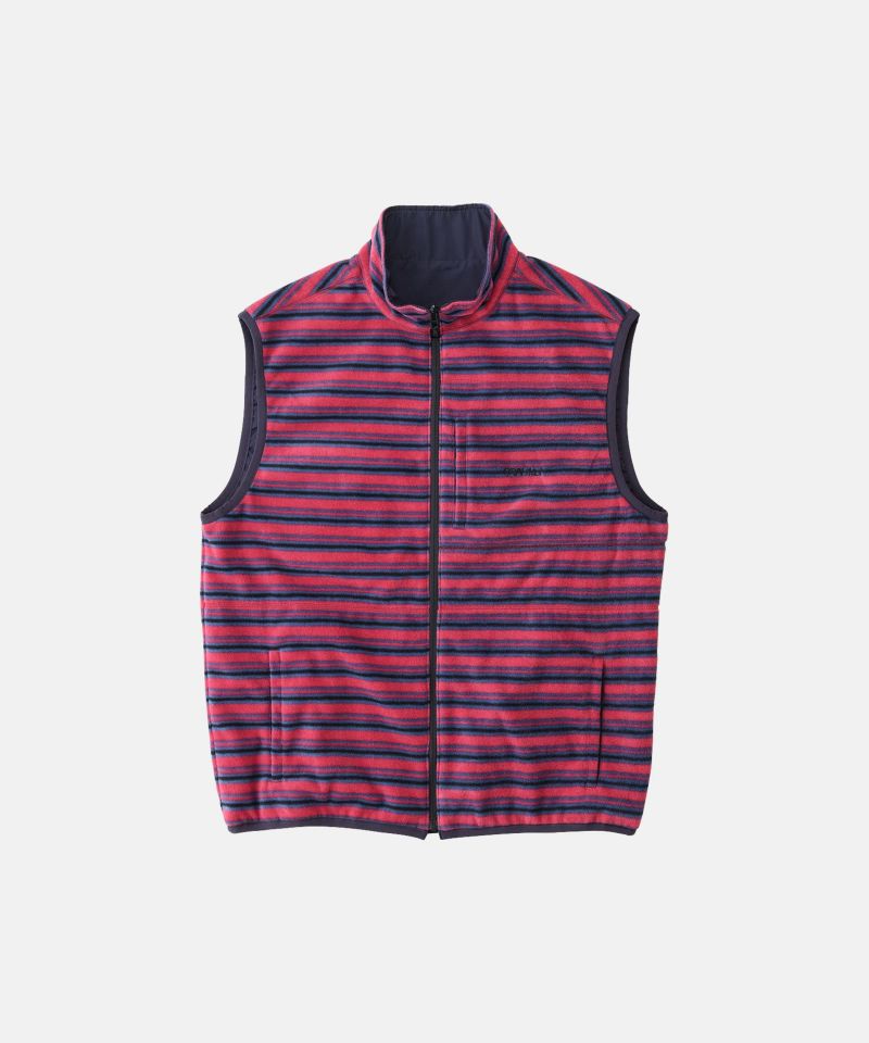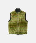 軽撥水性を備えたリップストップナイロン面と、環境にやさしいリサイクルポリエステルによる、やや厚手で柔らかいフリース面のリバーシブルベスト。程よくゆとりのあるシルエットなので、ミドラーにはもちろん、アウターとしても重宝します。フレッシュで且つクラシックなボーダーはスタイルのアクセントにもなります。