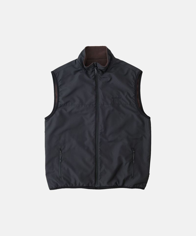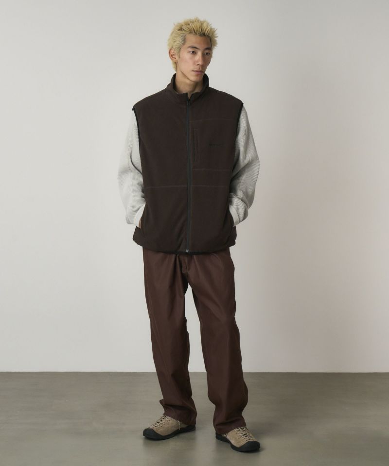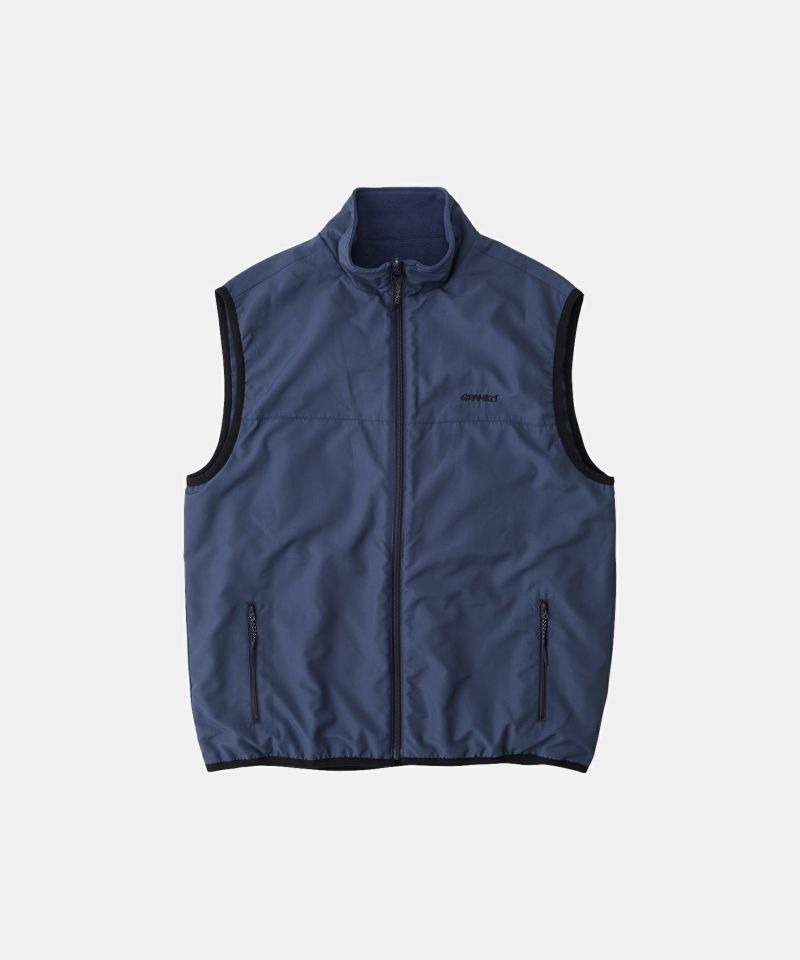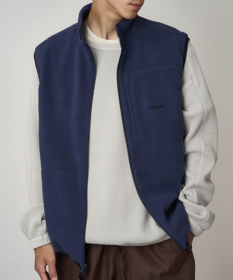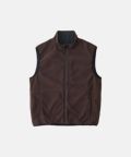 軽撥水性を備えたリップストップナイロン面と、環境にやさしいリサイクルポリエステルによる、やや厚手で柔らかいフリース面のリバーシブルベスト。程よくゆとりのあるシルエットなので、ミドラーにはもちろん、アウターとしても重宝します。フレッシュで且つクラシックなボーダーはスタイルのアクセントにもなります。