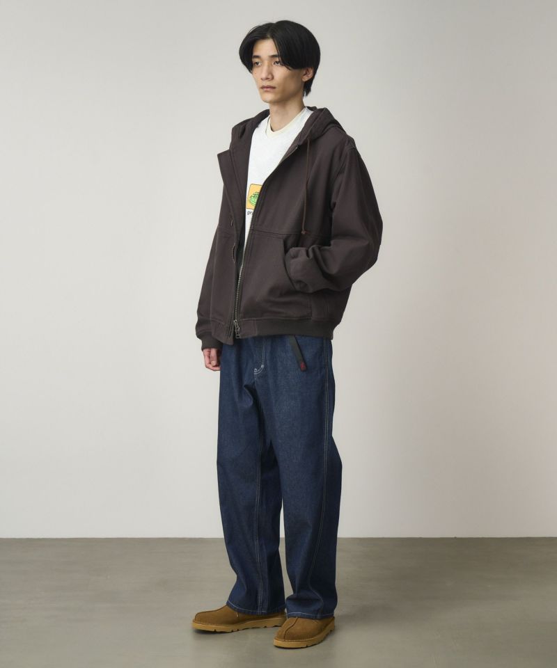 しっかりした質感でハリコシのある、環境配慮エココットンを使用した11オンスデニムの5pocketパンツは、ホワイトステッチでフレッシュな印象です。股上は深く、腰周りはスッキリとしたフィットで、裾巾の広いバギーストレートシルエットです。