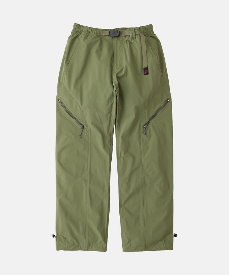 特殊なPTT繊維による、伸張回復力に優れたストレッチ性、コットンのような質感とドライな手触りが特徴的なリップストップによる、スッキリとしたストレートシルエットのパンツです。前後の切替えが特徴的な、両腿に大容量のジッパーポケットを備えたギアパンツです。