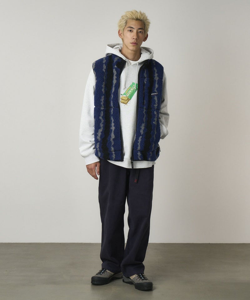 羊のようにモコモコした、暖かくボリューム感のある、オリジナルジャガードのボアベストです。衿端・アームホール・裾廻りにはニットテープを使用し、風の侵入を軽減します。両脇と左胸にジップ付きポケットを備えています。