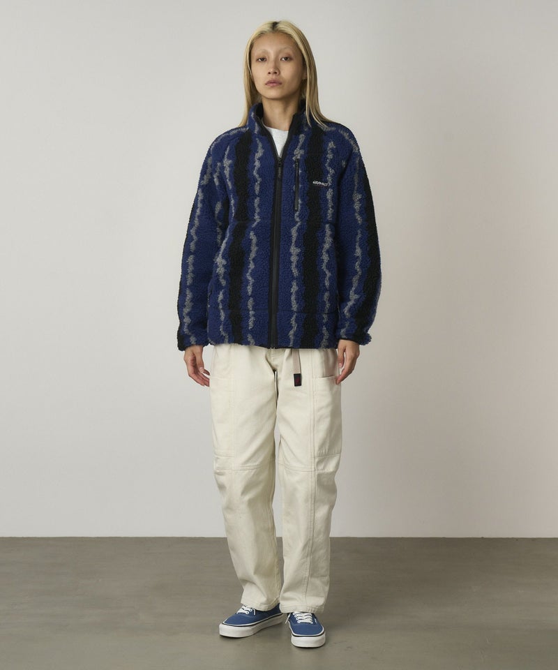 羊のようにモコモコした、暖かくボリューム感のある、オリジナルジャガードのスタンドカラージャケットです。衿端・袖口・裾廻りにはニットテープを使用し、風の侵入を軽減します。両脇と左胸にジップ付きポケットを備えています。