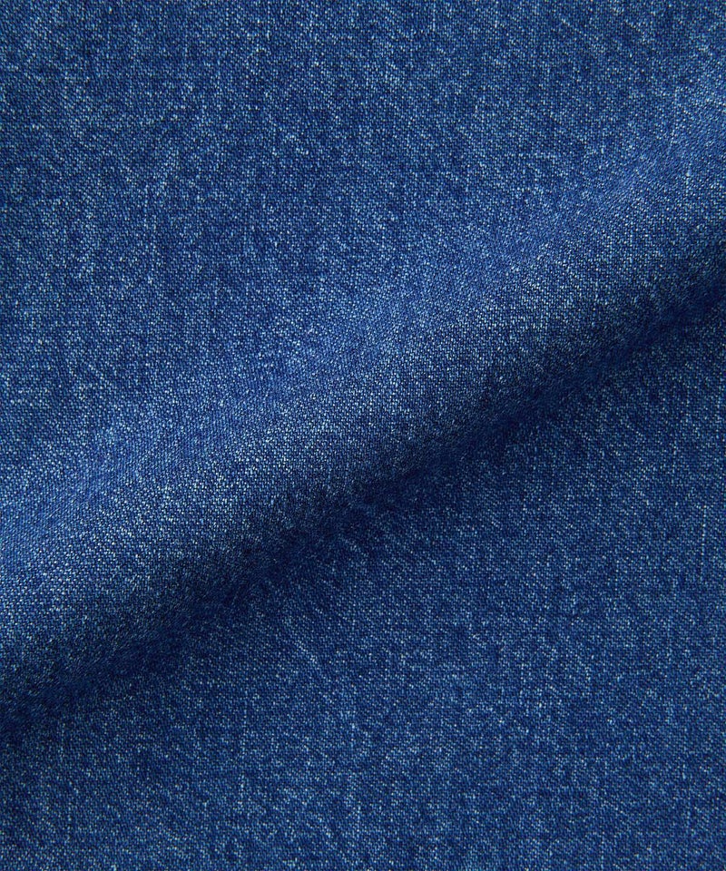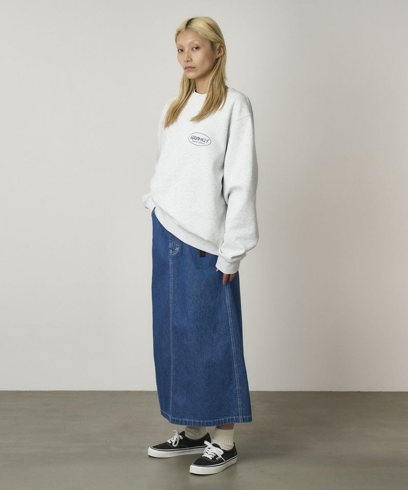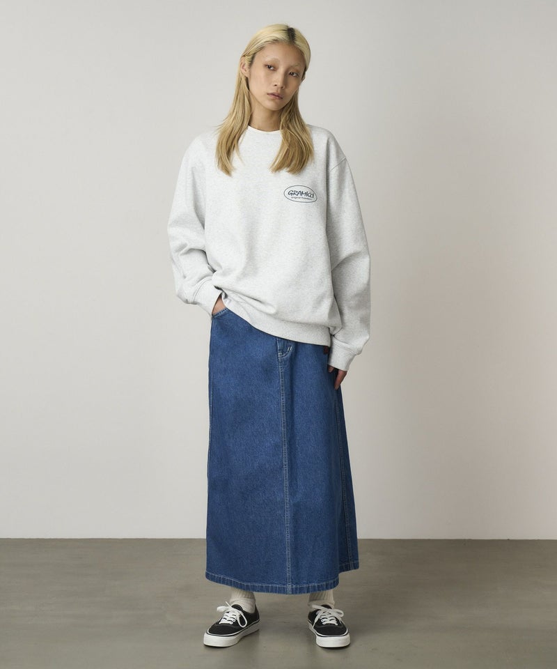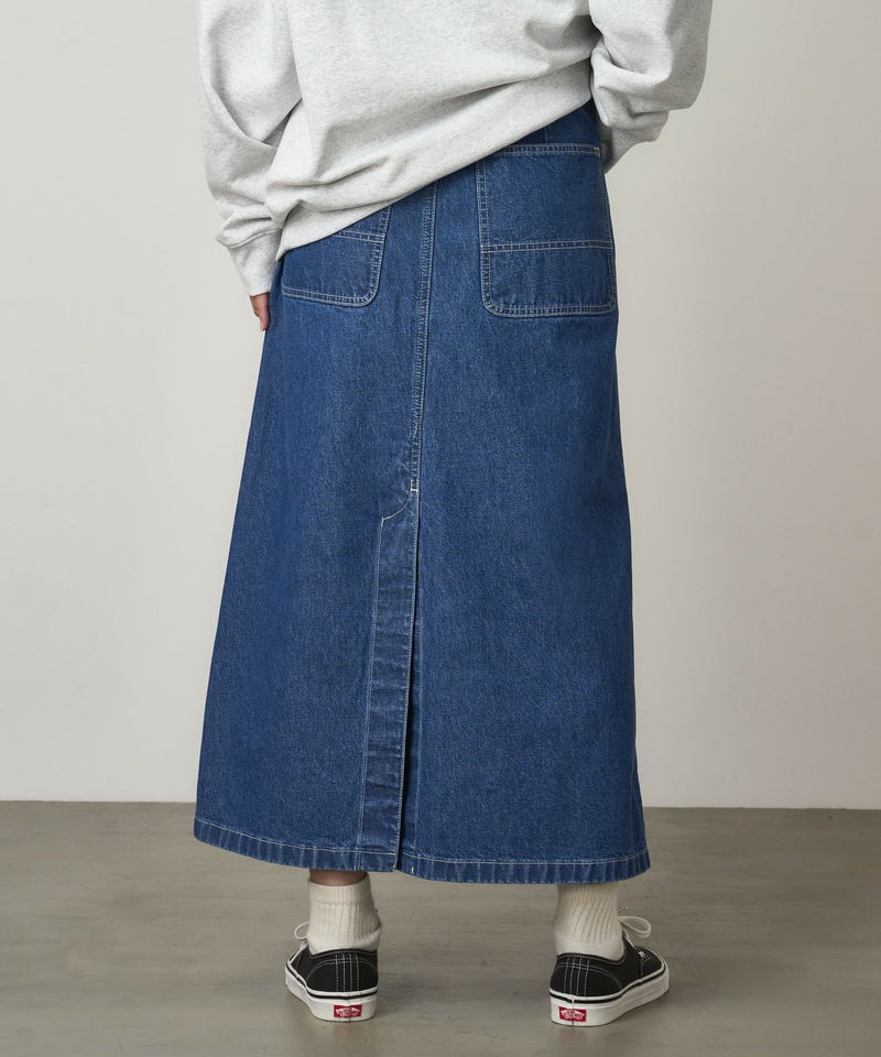 しっかりした質感でハリコシのある、環境配慮エココットンを使用した11オンスデニムを使用した、踝丈のマキシレングススカートは、ホワイトステッチでフレッシュな印象です。5pocketデザインでAラインシルエット、深めのスリットで足運びも問題ありません。