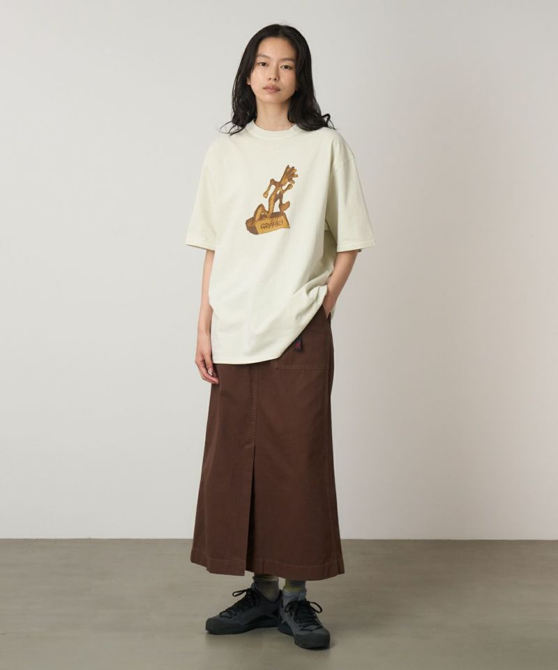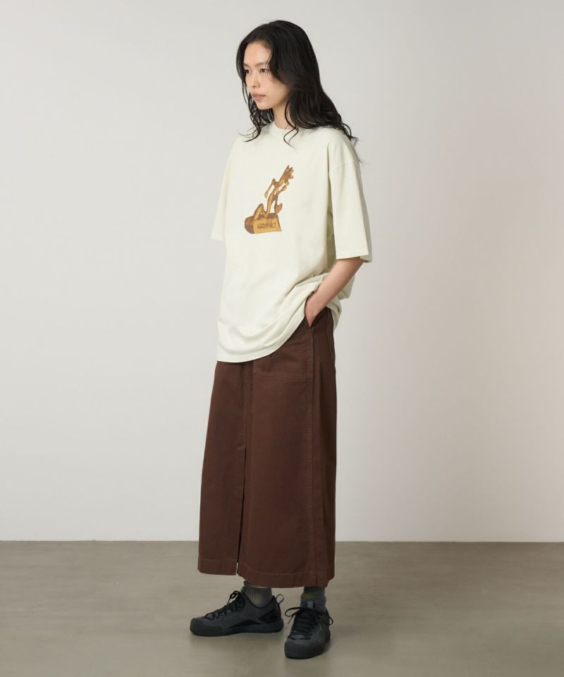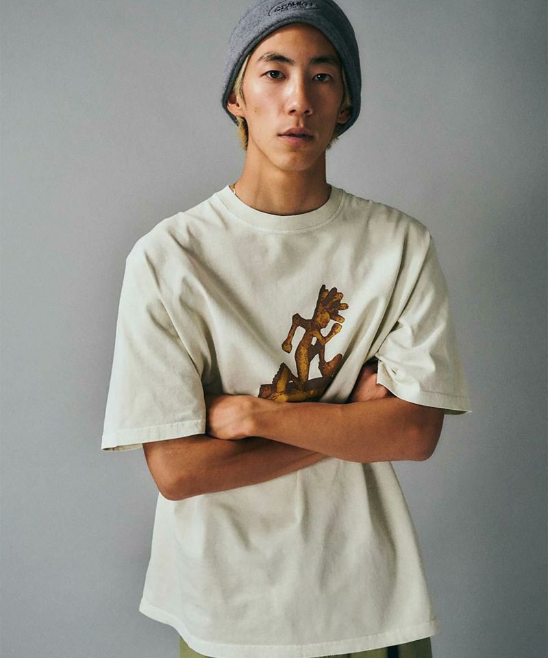 中厚手のドライタッチエココットンを使用した定番アイテム。夏はショーツと合わせて爽やかに、冬は重ね着のインナーとしても最適な、年間を通じて活躍する万能Tシャツ。シンプルでありながら、胸元に小さなグラフィック、背面には大きなグラフィックが印象的な一着です。