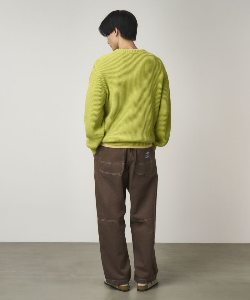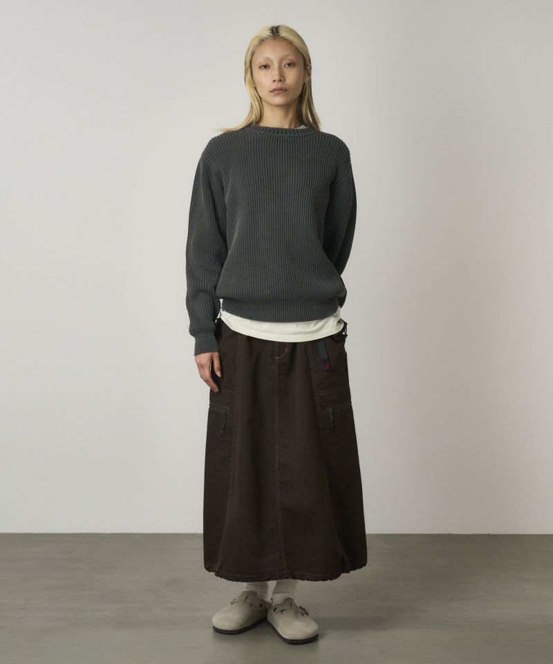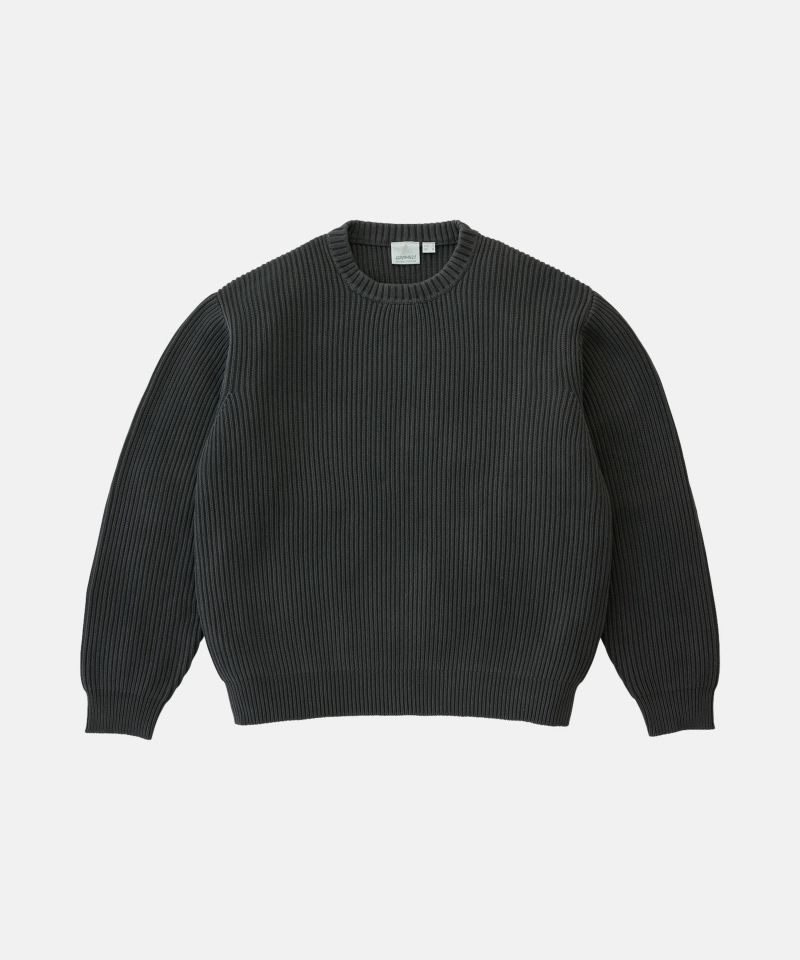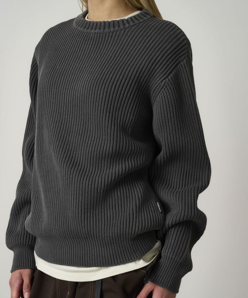 立体感のある編地のクルーネックニット。型崩れしにくいのが特徴です。製品でピグメント加工をしているため、深みあるカラーリングとなっています。ざっくりとしたサイズ感でゆったり着用いただけます。