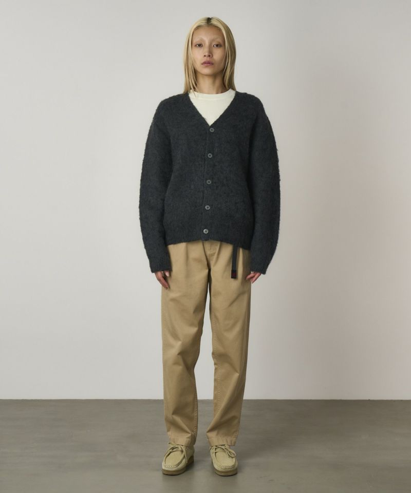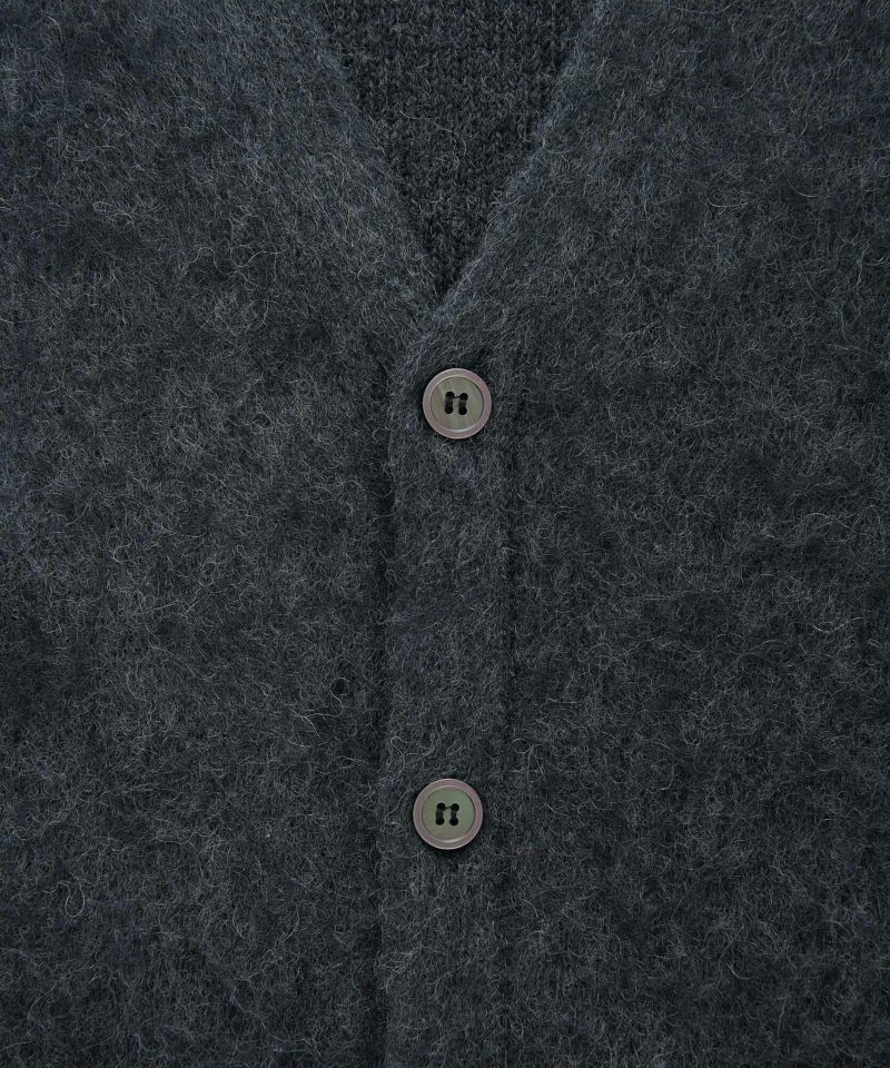 見た目も体感も温かな ふわふわとしたモヘアブレンド糸による、デジタルカモ柄とチャコールグレーでの色展開のニットカーディガンです。ざっくりとしたサイズ感で、軽く、ゆったり着用いただけます。