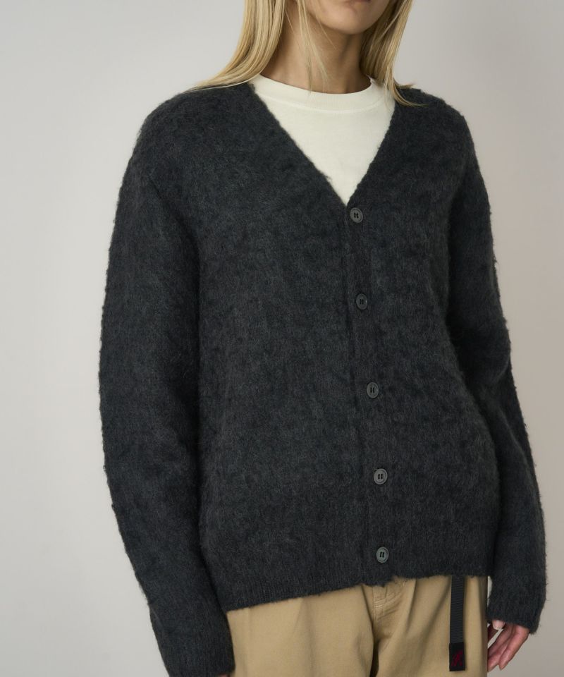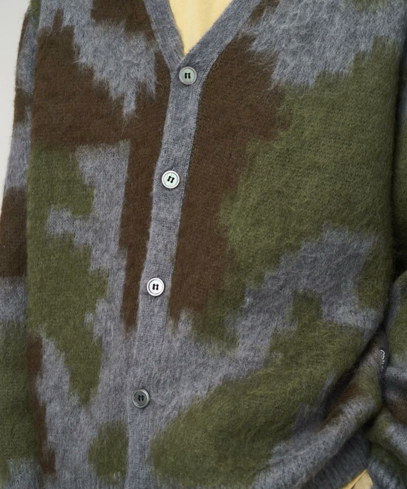 見た目も体感も温かな ふわふわとしたモヘアブレンド糸による、デジタルカモ柄とチャコールグレーでの色展開のニットカーディガンです。ざっくりとしたサイズ感で、軽く、ゆったり着用いただけます。