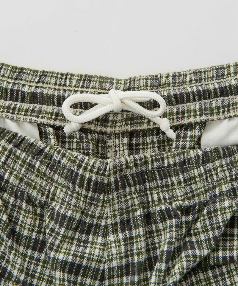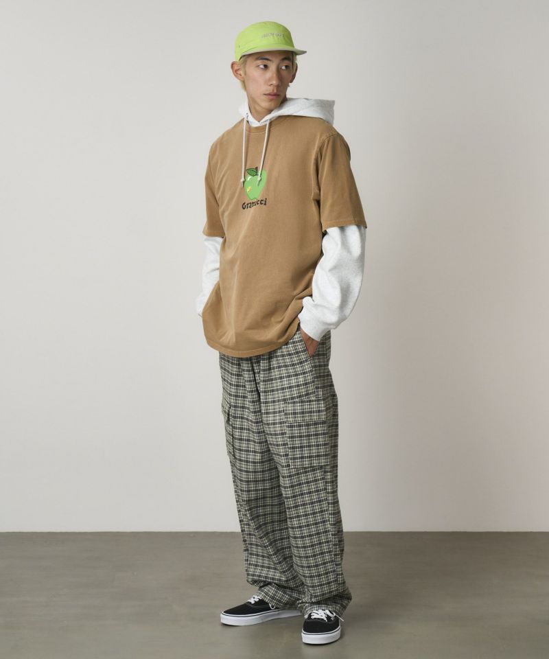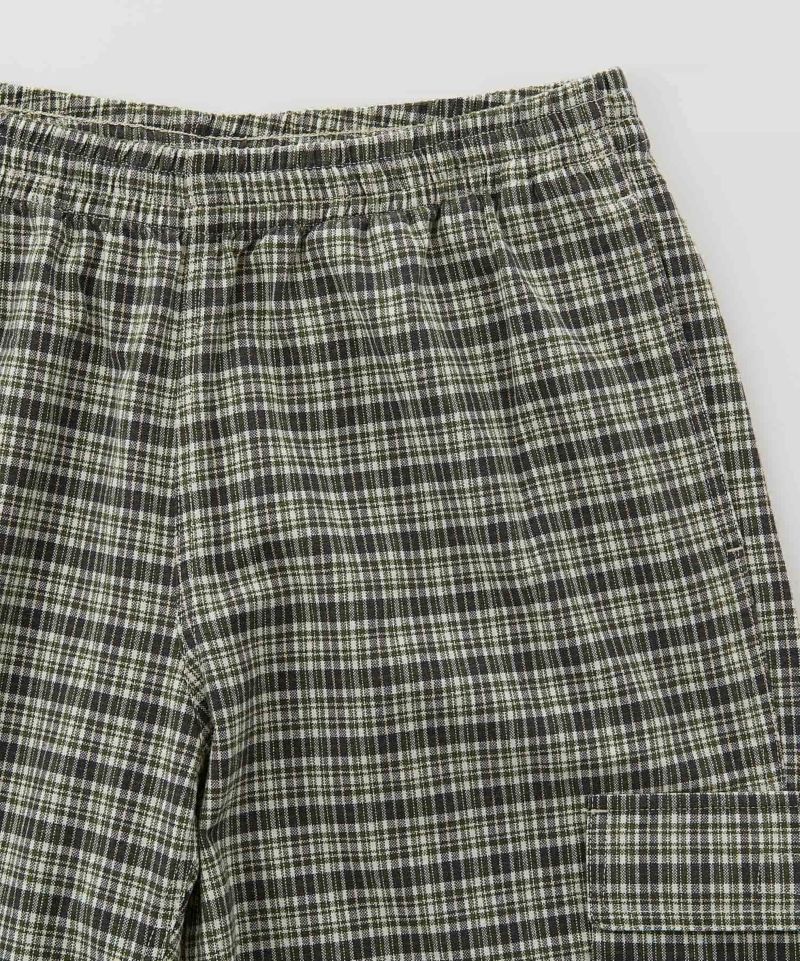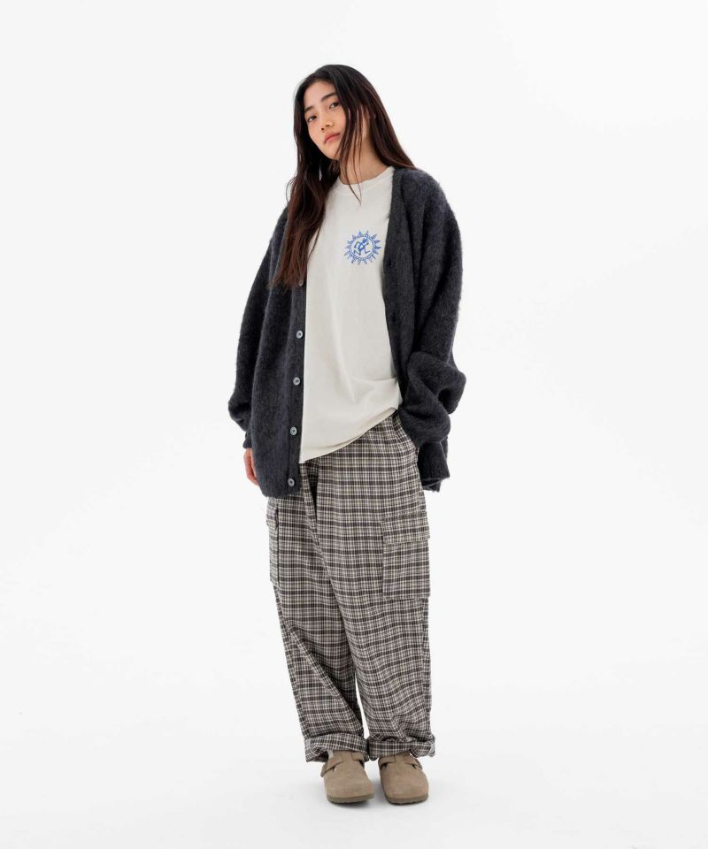 GRAMICCIでは最もゆとりのあるイージーシルエットで、ウェストはゴム + ドローコード仕様の定番SWELL PANT。FW25のシーズナルSWELL PANTは、微起毛のコットンチェック素材でのカーゴパンツデザインです。