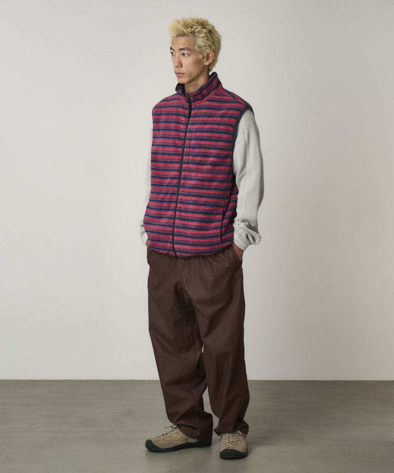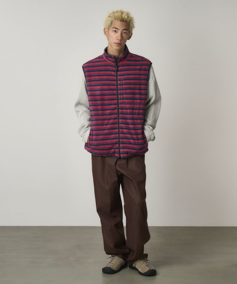 軽撥水性を備えたリップストップナイロン面と、環境にやさしいリサイクルポリエステルによる、やや厚手で柔らかいフリース面のリバーシブルベスト。程よくゆとりのあるシルエットなので、ミドラーにはもちろん、アウターとしても重宝します。フレッシュで且つクラシックなボーダーはスタイルのアクセントにもなります。
