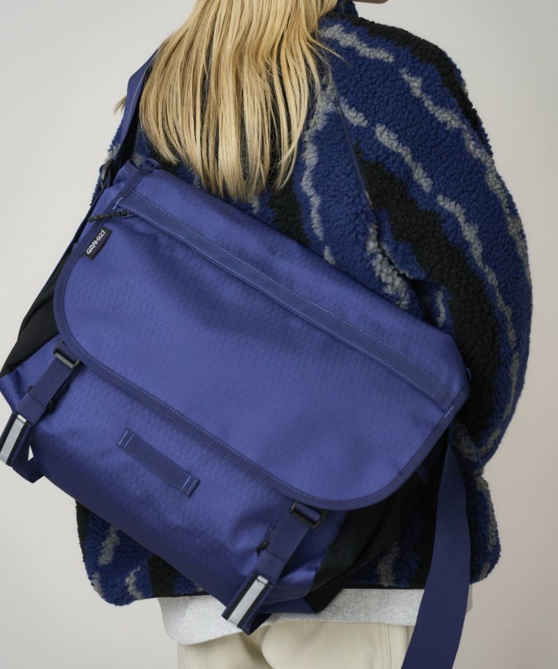両サイドにメッシュポケット、フロントフラップにはジッパールーム、約25Lとしっかりとした容量のメインルームにはラップトップ用の仕切りと、ジッパーポケット、キーホルダーを備えています。着脱式のショルダーパッド、リフレクターテープも備えています。廃材から100%リサイクルされたポリエステル糸によるCORDURA?ファブリックは、軽量且つ、引裂、摩擦、摩耗に対して優れた耐久性があります。配色糸を用い、ドビー織りでダイヤチェック柄RIPSTOPを構成、強度に加え見た目にもインパクトがあります。