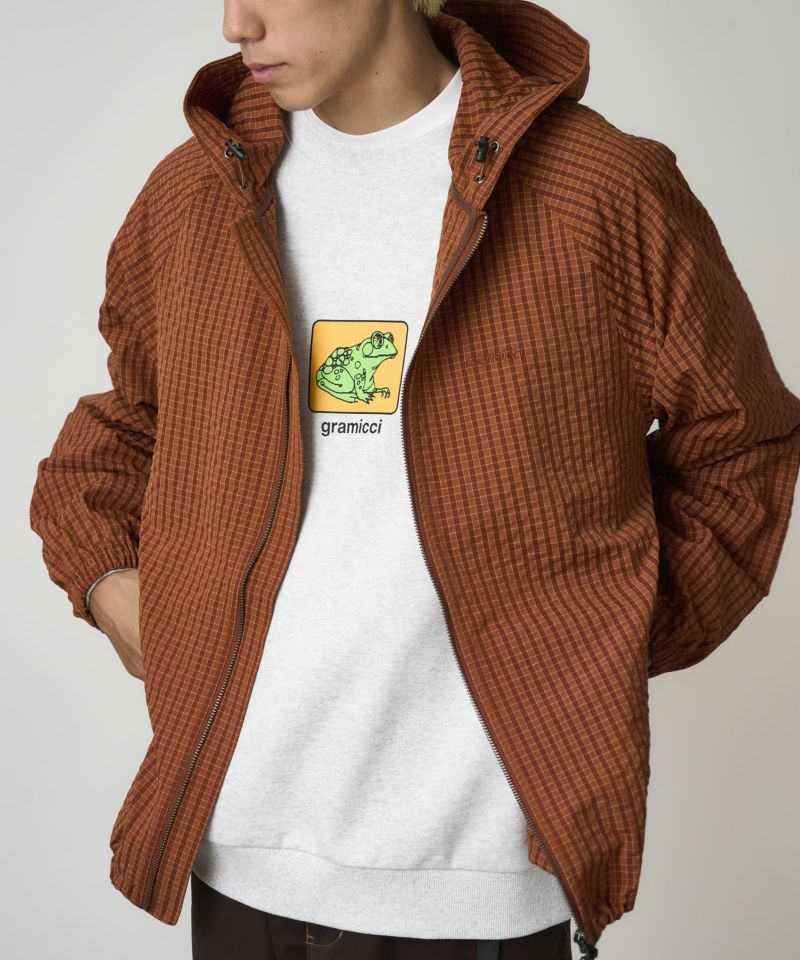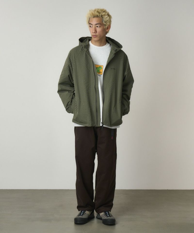 ラグランスリーブのフーデッドジャケットは、特性が異なる2種類の糸を用いて織機し、染色からくる縮率の差によって生地表面に独特の凹凸がある、シアサッカー調のユニークな素材を使用しています。独特のハリ感があり、軽撥水性も持ち合わせています。
