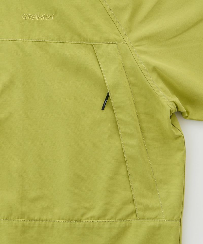 天然繊維と合繊をブレンドしたハイブリッドな高密度素材で、表面は微起毛しているため、独特のヌメ感があり、滑らかでソフトな質感、加えて程よいハリも持ち合わせています。両脇のボリュームポケットを備えたラグランフーデッドジャケットは、後身頃にベンチレーション機能も持ち合わせています。