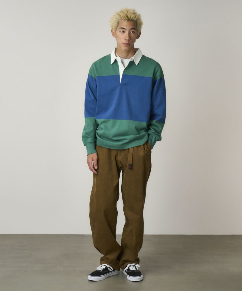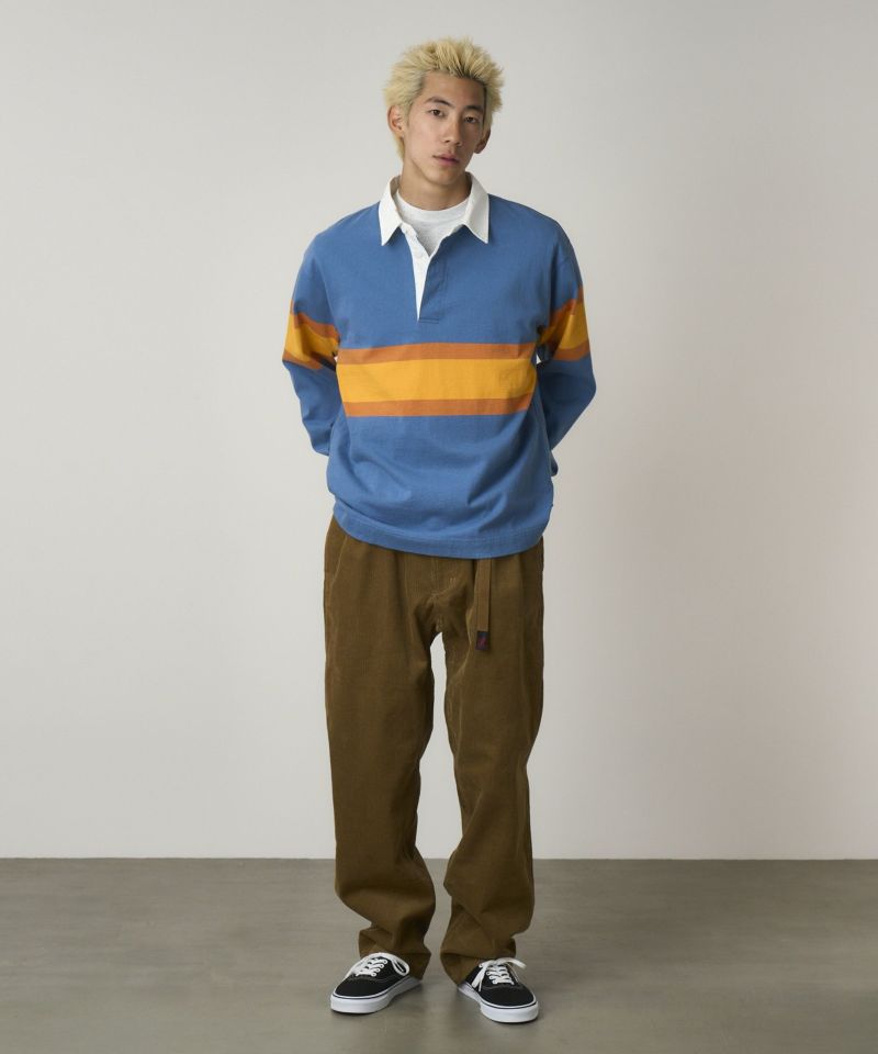 70年代のクライマーがこぞって着用していたのが、丈夫なラグビーシャツ。動きやすさとタフさを求められるクライミングにはピッタリだったようです。ドライタッチで繰り返し洗濯しても型崩れしにくい、耐久性の高いコットン天竺と、衿にはツイル、前立てにはコットンナイロンを使用し、2種類ボーダーでの展開です。着こむほどに雰囲気の出る一枚です。