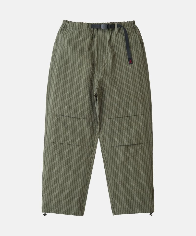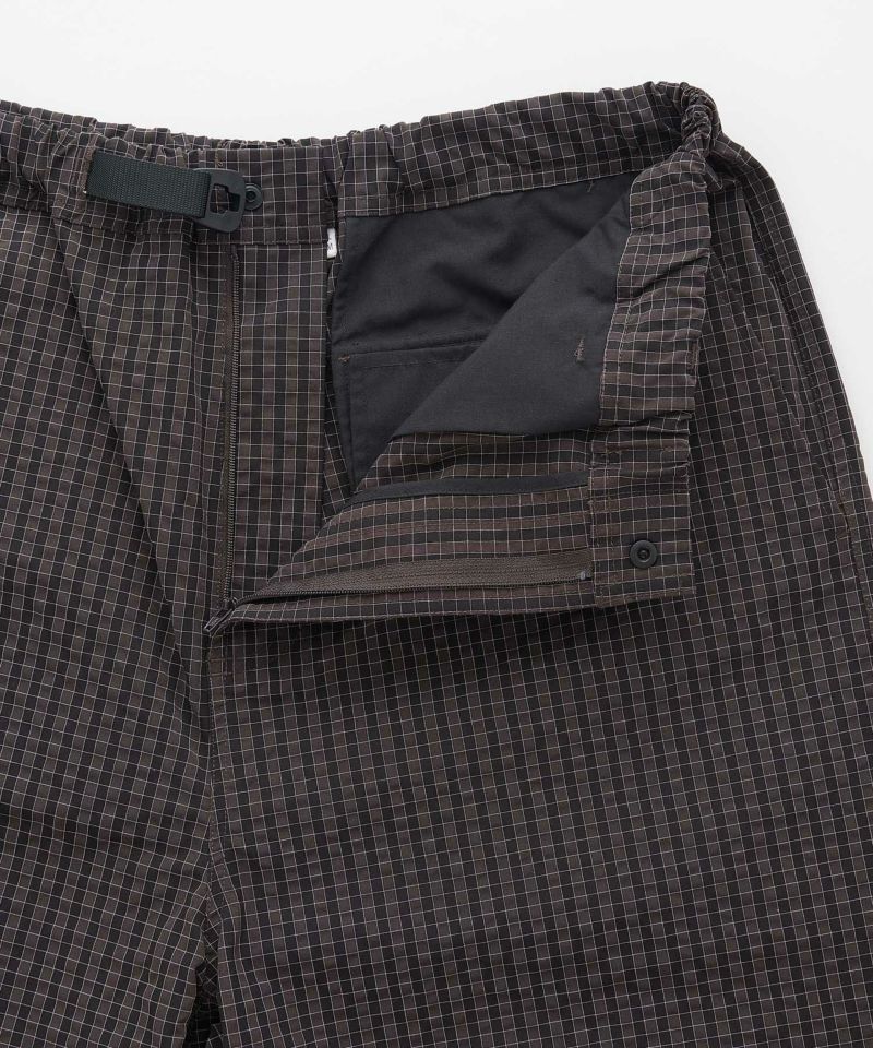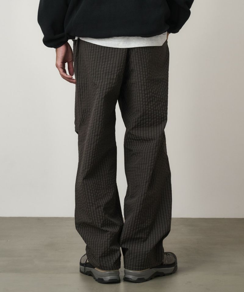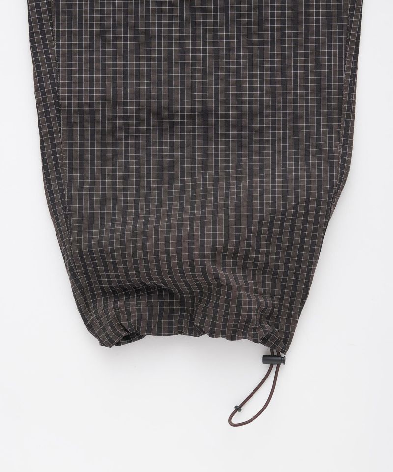 特性が異なる2種類の糸を用いて織機し、染色からくる縮率の差によって生地表面に独特の凹凸がある、シアサッカー調のユニークな素材は、独特のハリ感があり、軽撥水性も持ち合わせています。膝にタックをとったゆとりあるシルエットのパンツは、裾はドローコード仕様で、後身頃にフラップポケットを備えています。