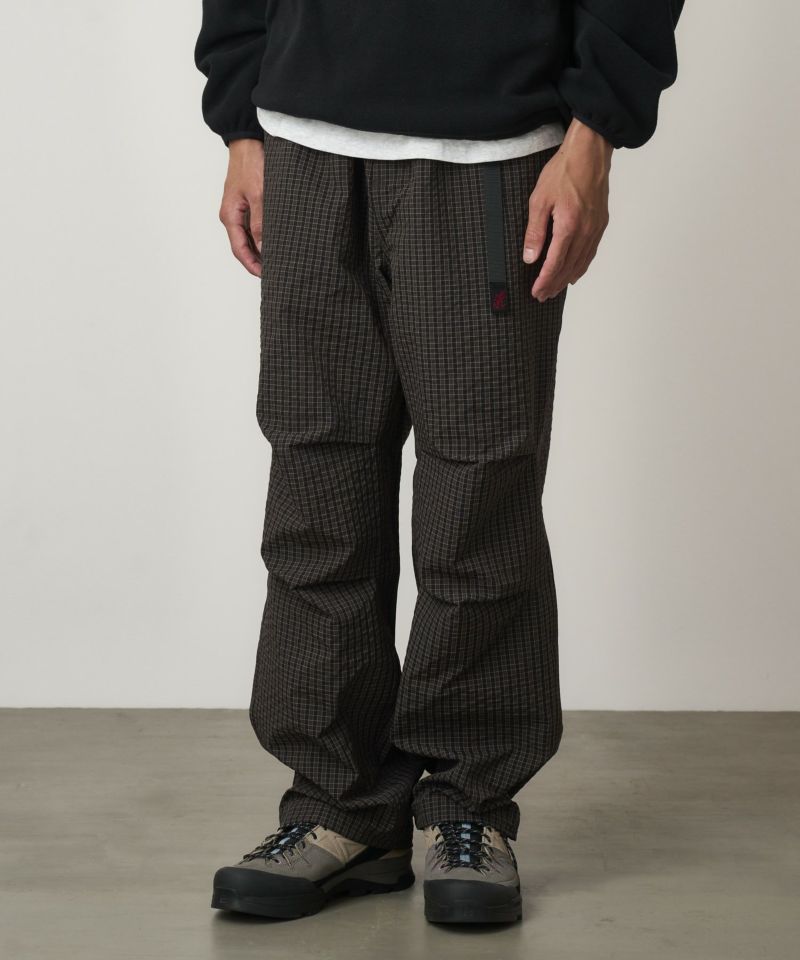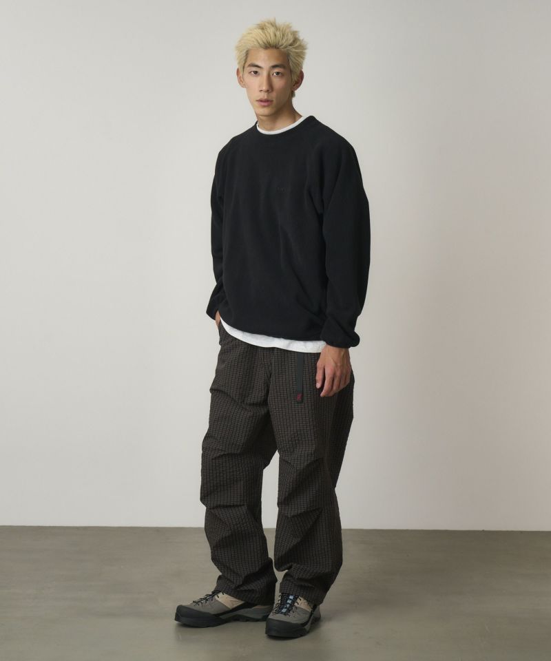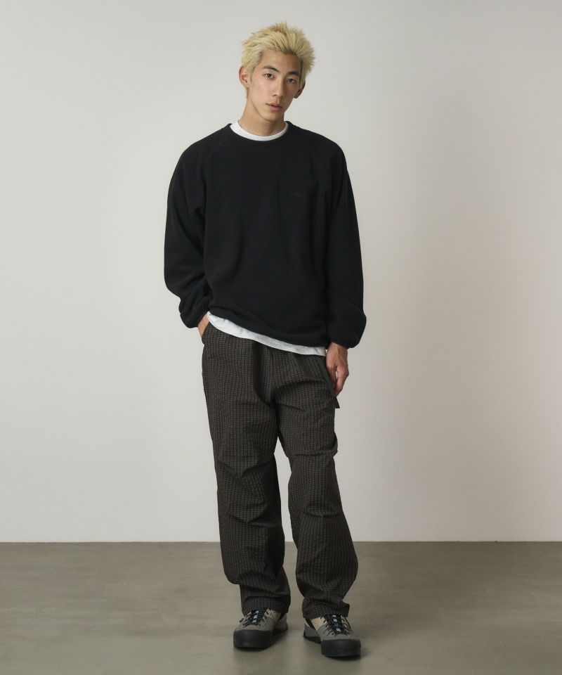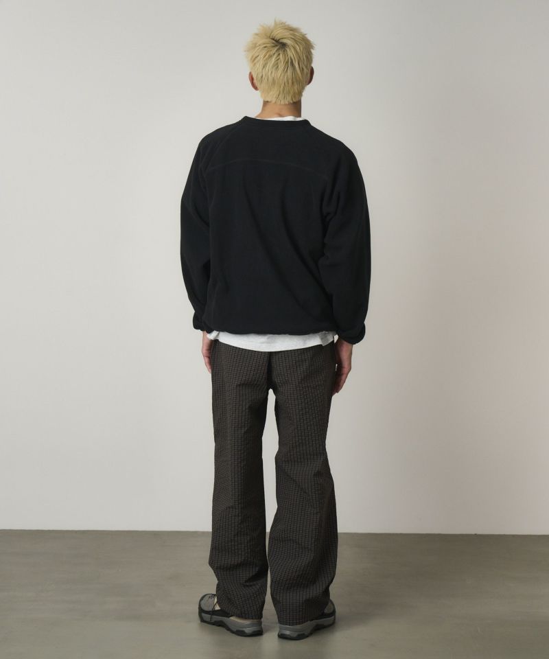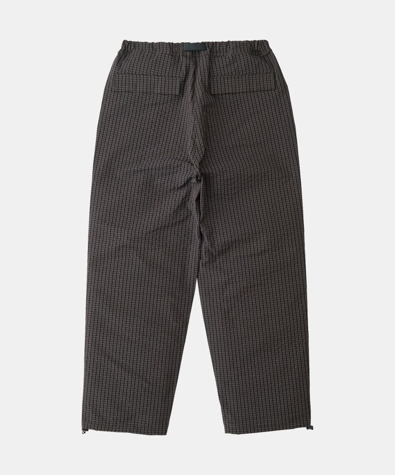 特性が異なる2種類の糸を用いて織機し、染色からくる縮率の差によって生地表面に独特の凹凸がある、シアサッカー調のユニークな素材は、独特のハリ感があり、軽撥水性も持ち合わせています。膝にタックをとったゆとりあるシルエットのパンツは、裾はドローコード仕様で、後身頃にフラップポケットを備えています。