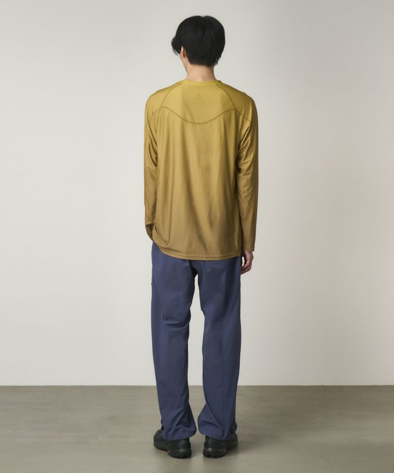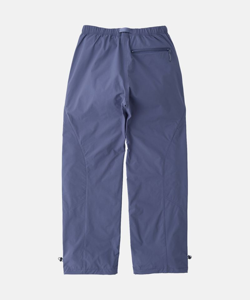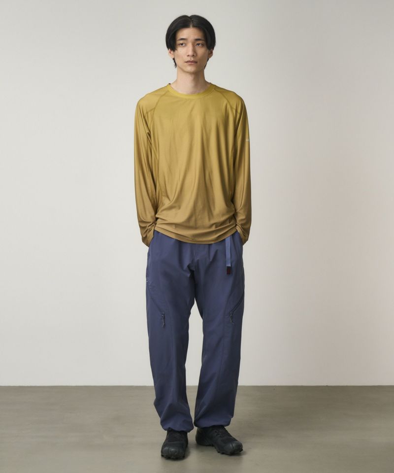特殊なPTT繊維による、伸張回復力に優れたストレッチ性、コットンのような質感とドライな手触りが特徴的なリップストップによる、スッキリとしたストレートシルエットのパンツです。前後の切替えが特徴的な、両腿に大容量のジッパーポケットを備えたギアパンツです。