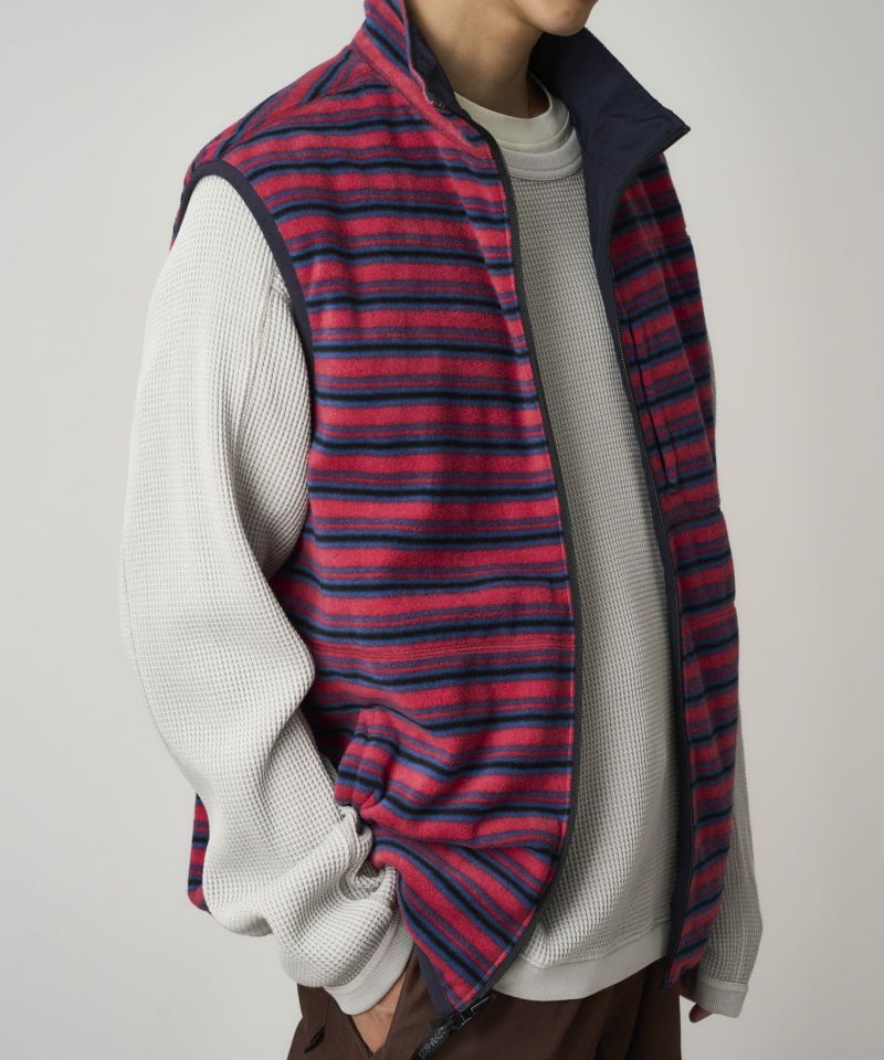 軽撥水性を備えたリップストップナイロン面と、環境にやさしいリサイクルポリエステルによる、やや厚手で柔らかいフリース面のリバーシブルベスト。程よくゆとりのあるシルエットなので、ミドラーにはもちろん、アウターとしても重宝します。フレッシュで且つクラシックなボーダーはスタイルのアクセントにもなります。