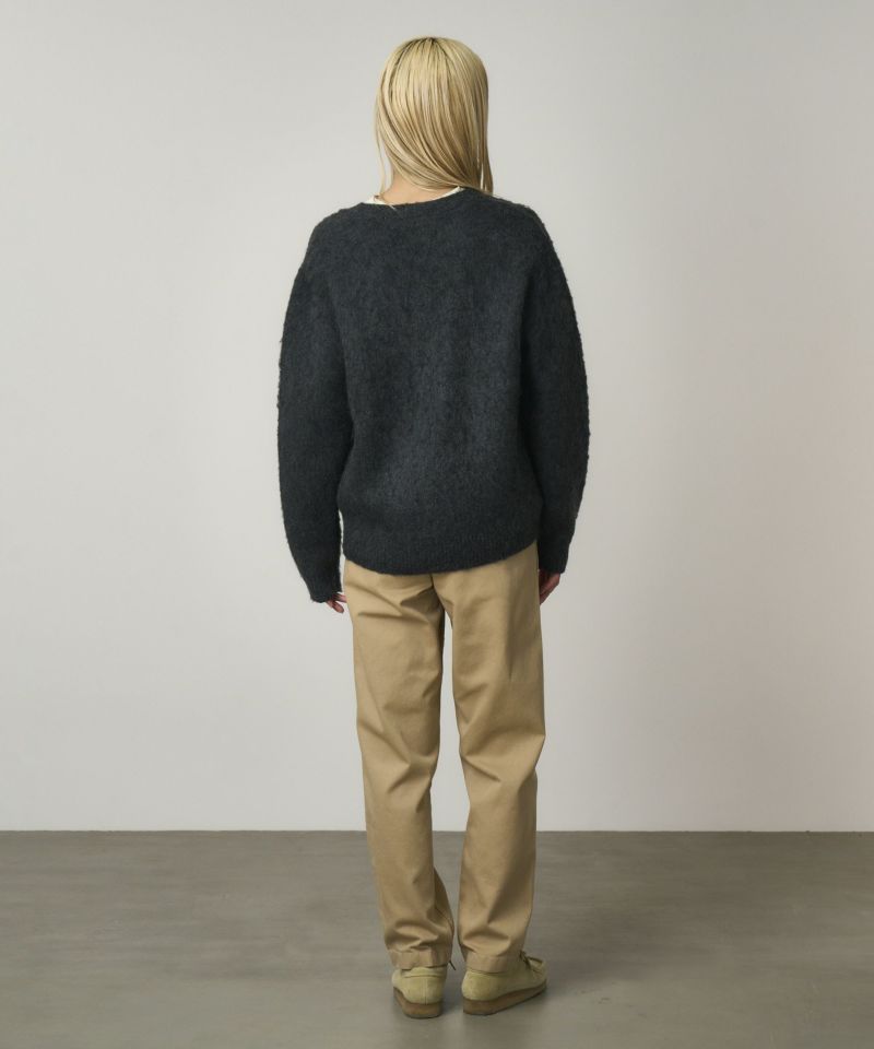 見た目も体感も温かな ふわふわとしたモヘアブレンド糸による、デジタルカモ柄とチャコールグレーでの色展開のニットカーディガンです。ざっくりとしたサイズ感で、軽く、ゆったり着用いただけます。