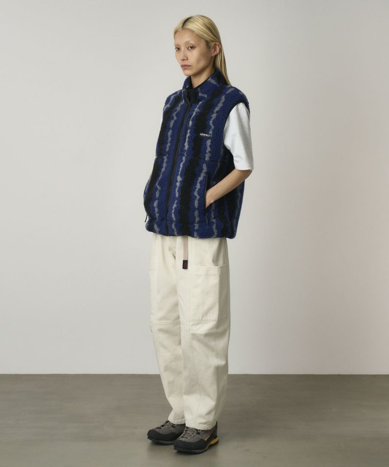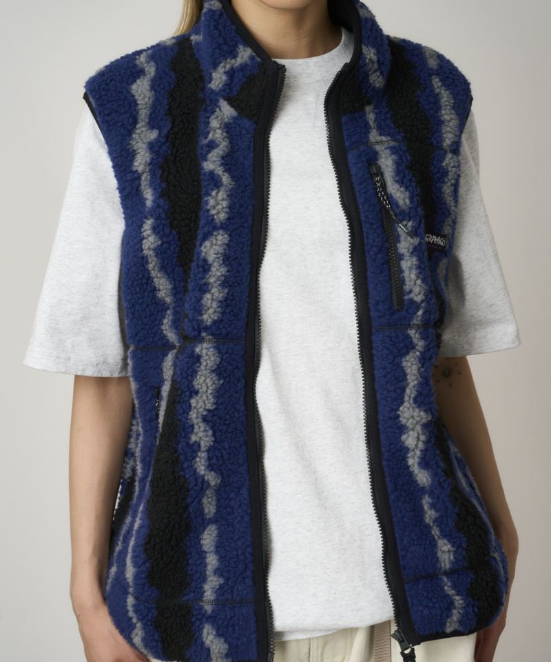 羊のようにモコモコした、暖かくボリューム感のある、オリジナルジャガードのボアベストです。衿端・アームホール・裾廻りにはニットテープを使用し、風の侵入を軽減します。両脇と左胸にジップ付きポケットを備えています。
