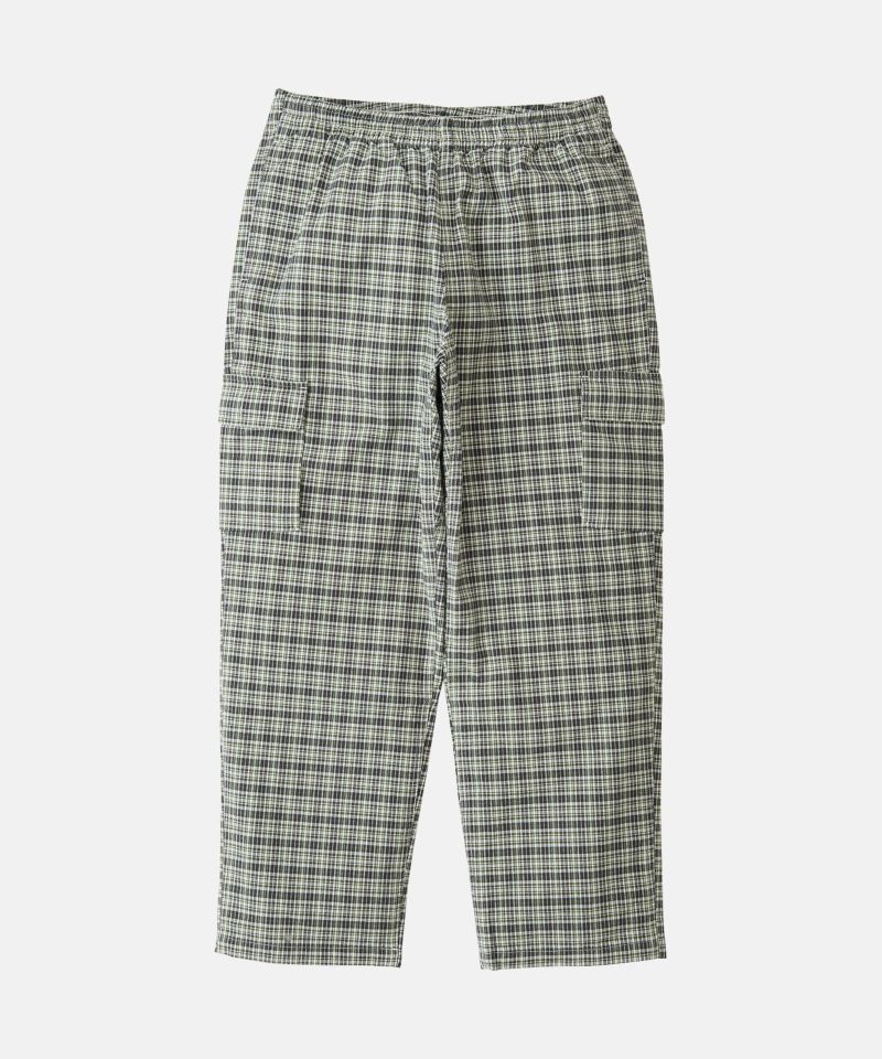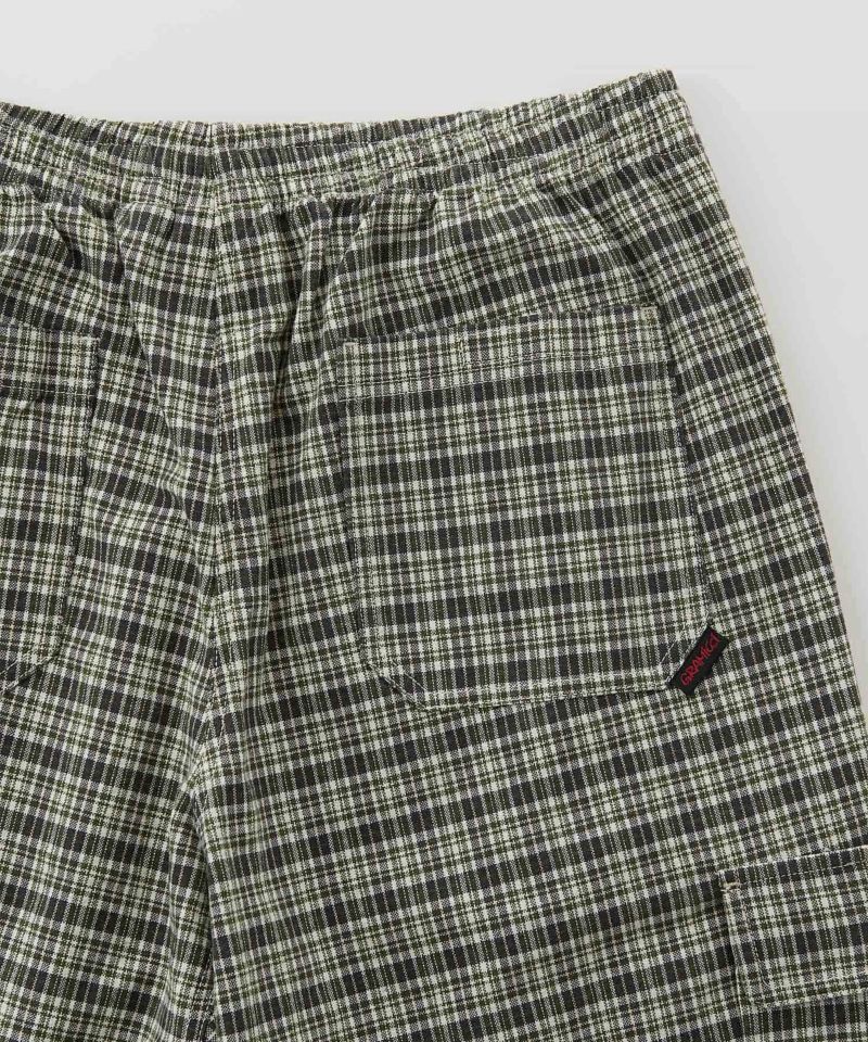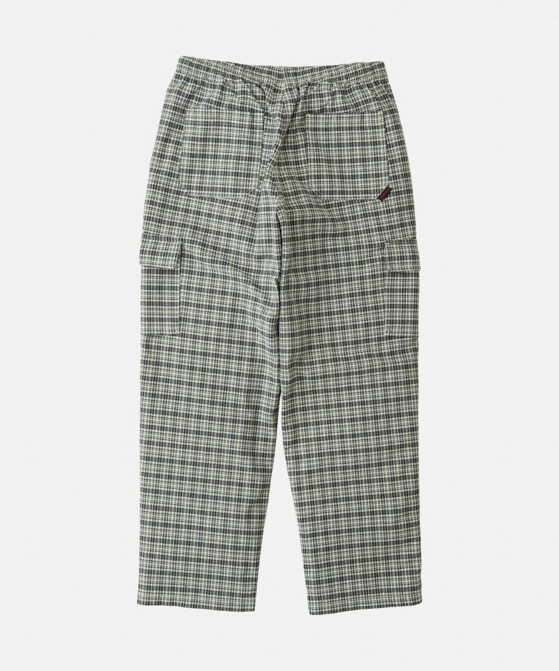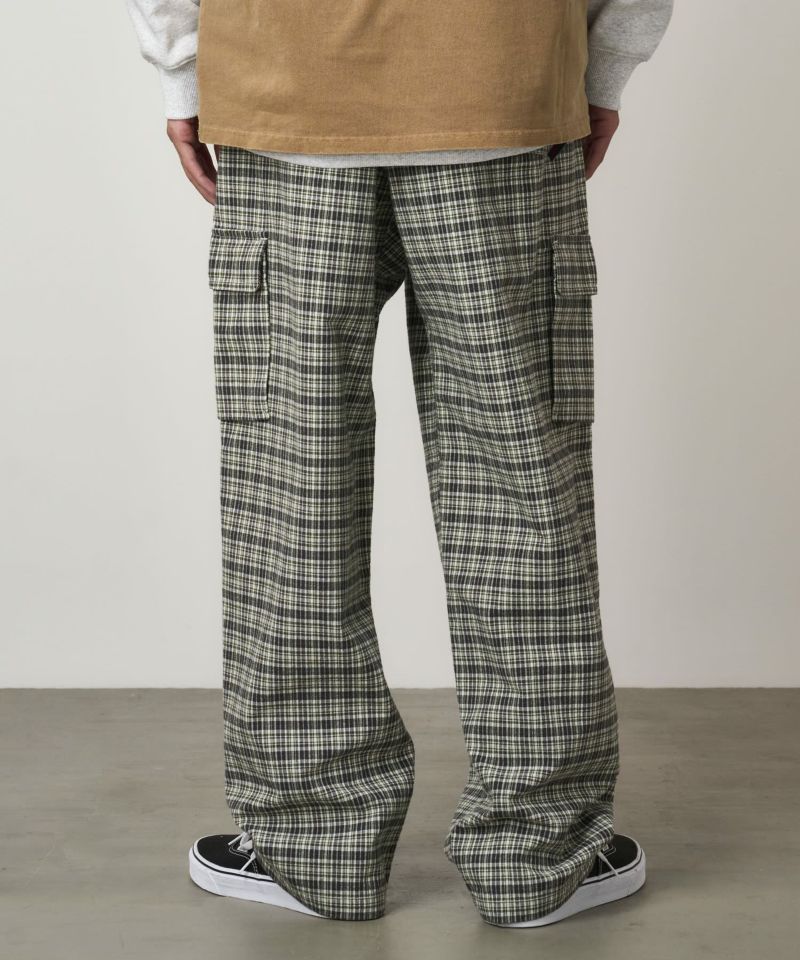 GRAMICCIでは最もゆとりのあるイージーシルエットで、ウェストはゴム + ドローコード仕様の定番SWELL PANT。FW25のシーズナルSWELL PANTは、微起毛のコットンチェック素材でのカーゴパンツデザインです。