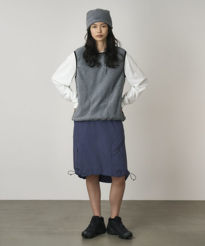 ジッパーポケットを3つ備えたプルオーバーのフリースベスト。裾はドローコード仕様で、シルエットや防風のアレンジが可能です。環境にやさしいリサイクルポリエステルによる、やや厚手で柔らかいフリース素材を使用し、軽く、暖かで、フレッシュで且つクラシックなボーダーはスタイルのアクセントにもなります。
