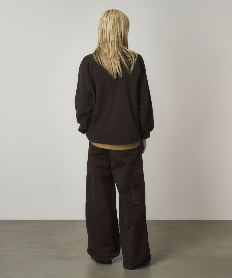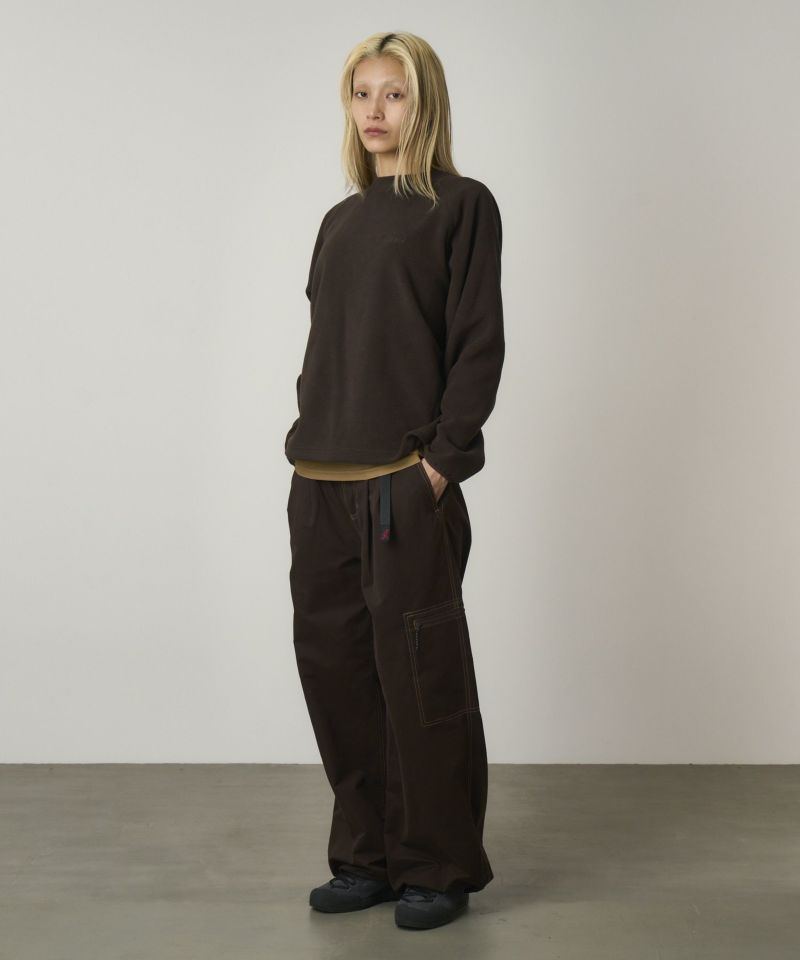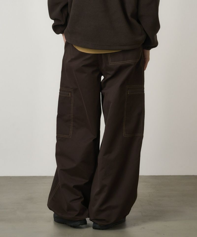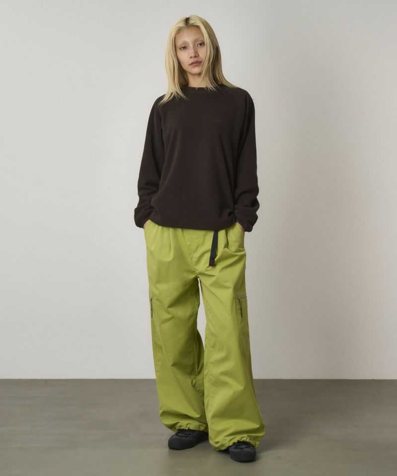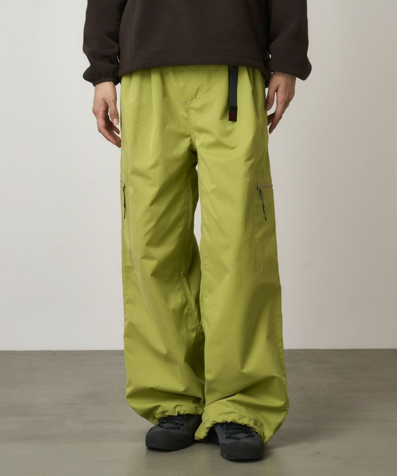 天然繊維と合繊をブレンドしたハイブリッドな高密度素材で、表面は微起毛しているため、独特のヌメ感があり、滑らかでソフトな質感、加えて程よいハリも持ち合わせています。ジッパーカーゴポケットを備えた、WOMENSでは最もワイドなシルエットで、裾口のドローコードでシルエットアレンジも可能です。