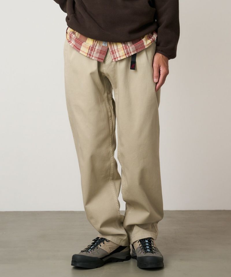 ブランドのシグネチャーモデル「グラミチパンツ」は、1980年代から変わらぬ定番として展開してきた一本です。素材には耐久性のあるエココットンツイル素材を使用。動きやすさを追求した設計で、180度の脚の可動域を確保するGramicci独自のダイヤモンドガゼットクロッチを採用し、ウエストにはナイロン製のウェビングベルトとゴム仕様を組み合わせ、快適なフィット感を実現しています。その汎用性の高さからクライミングだけでなく、ハイキングやサイクリングなどのアウトドアシーンにはもちろん、休日のリラックススタイルにも最適です。