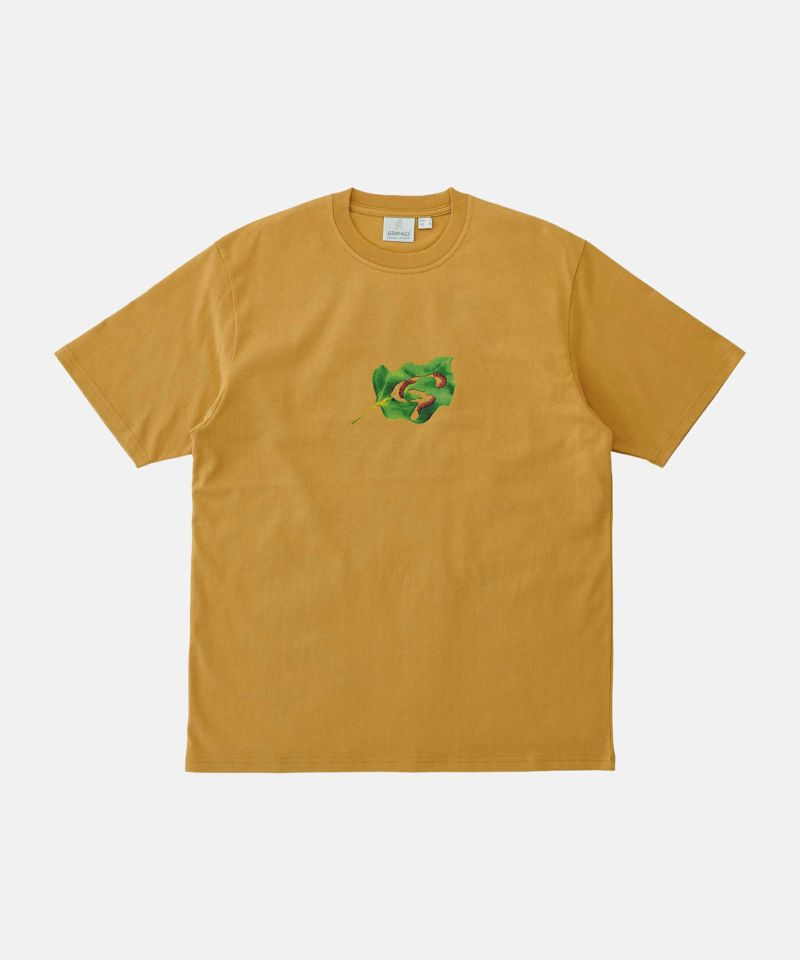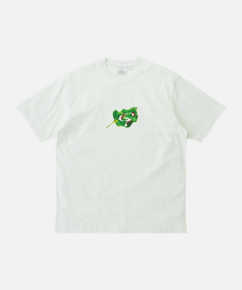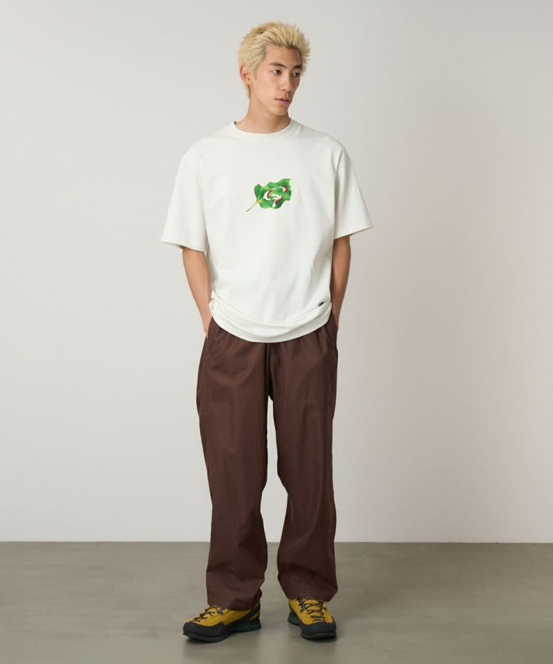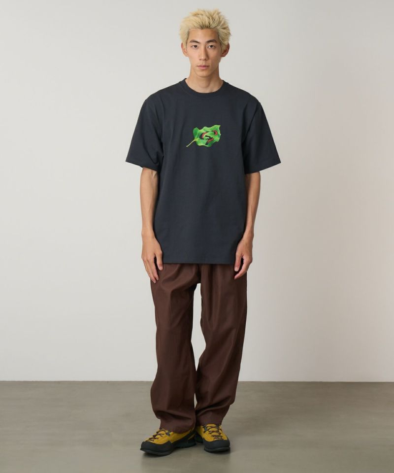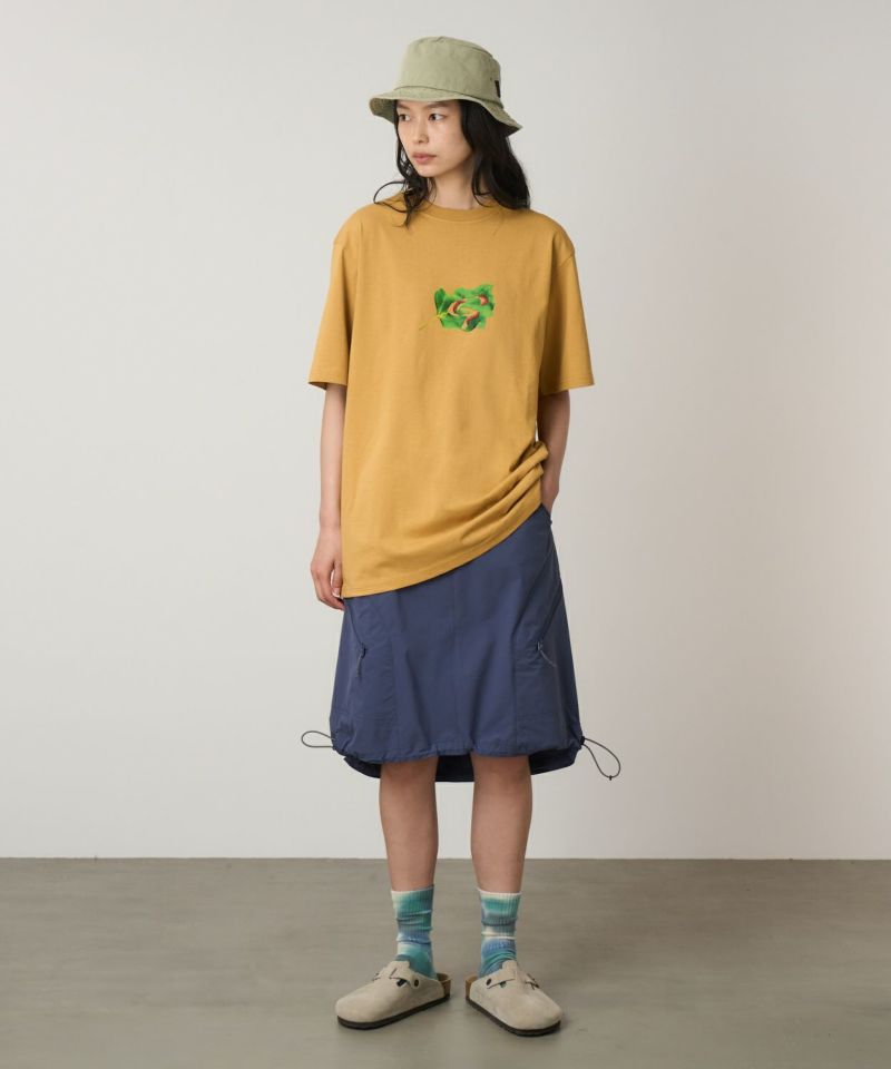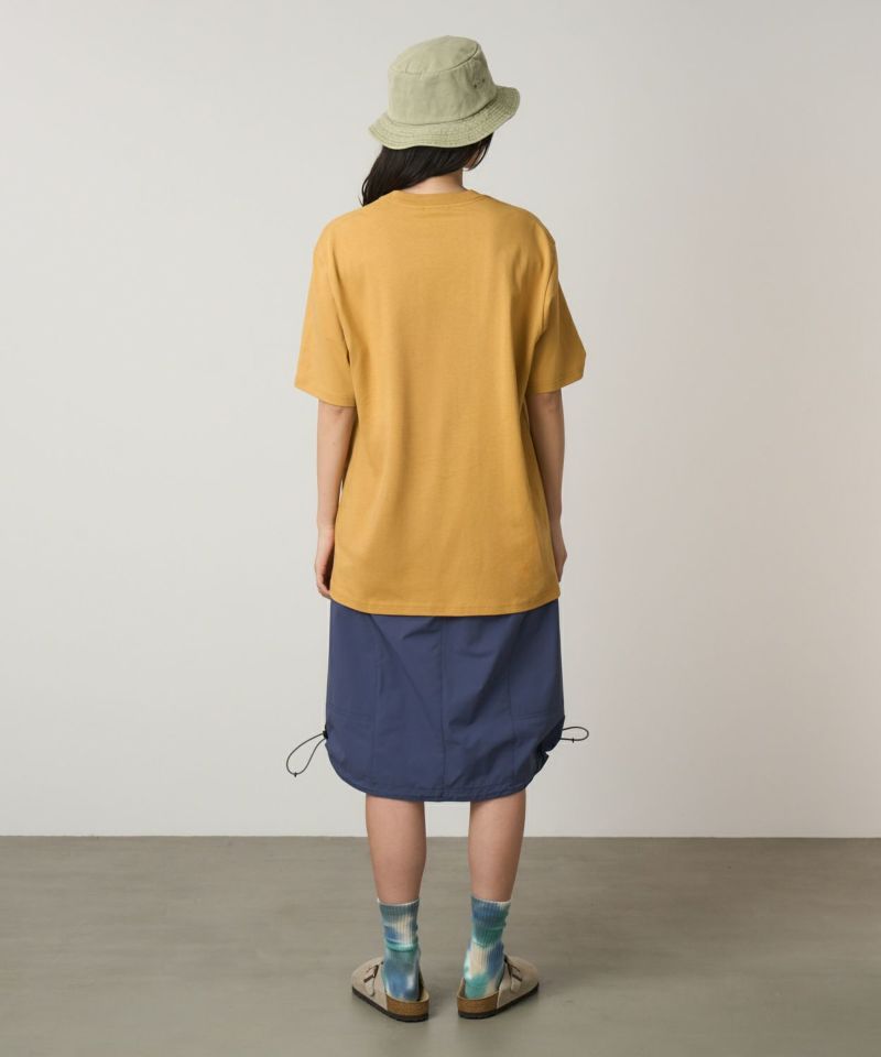 中厚手のドライタッチエココットンを使用した定番アイテム。夏はショーツと合わせて爽やかに、冬は重ね着のインナーとしても最適な、年間を通じて活躍する万能Tシャツ。シンプルでありながら、胸元に小さなグラフィック、背面には大きなグラフィックが印象的な一着です。
