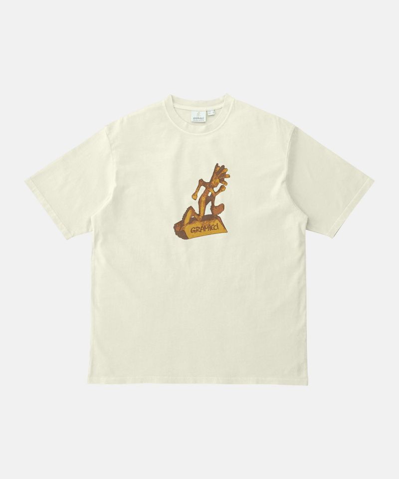 中厚手のドライタッチエココットンを使用した定番アイテム。夏はショーツと合わせて爽やかに、冬は重ね着のインナーとしても最適な、年間を通じて活躍する万能Tシャツ。シンプルでありながら、胸元に小さなグラフィック、背面には大きなグラフィックが印象的な一着です。