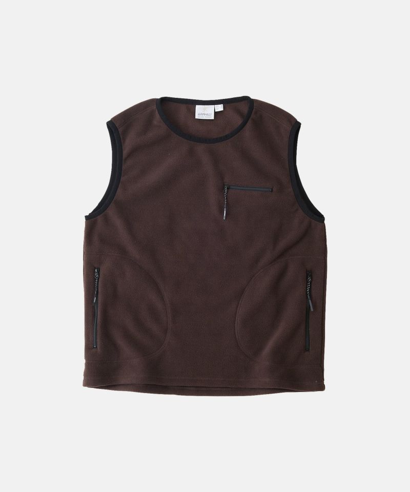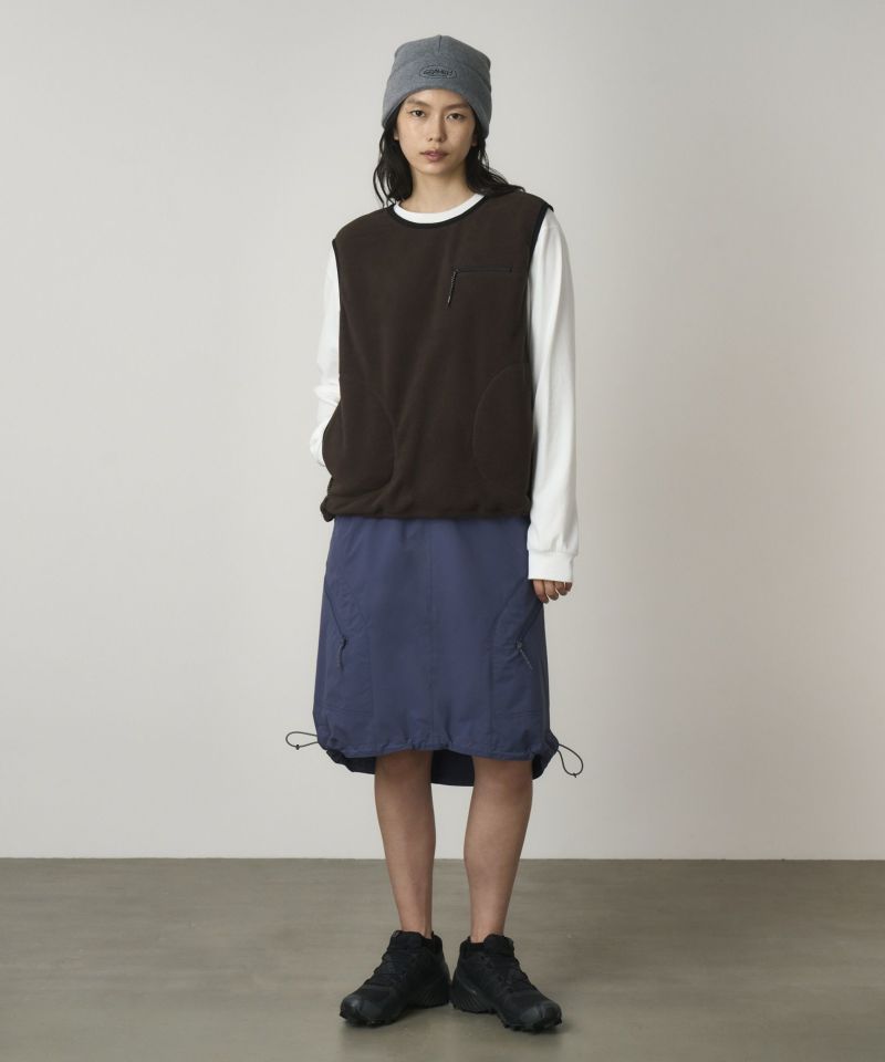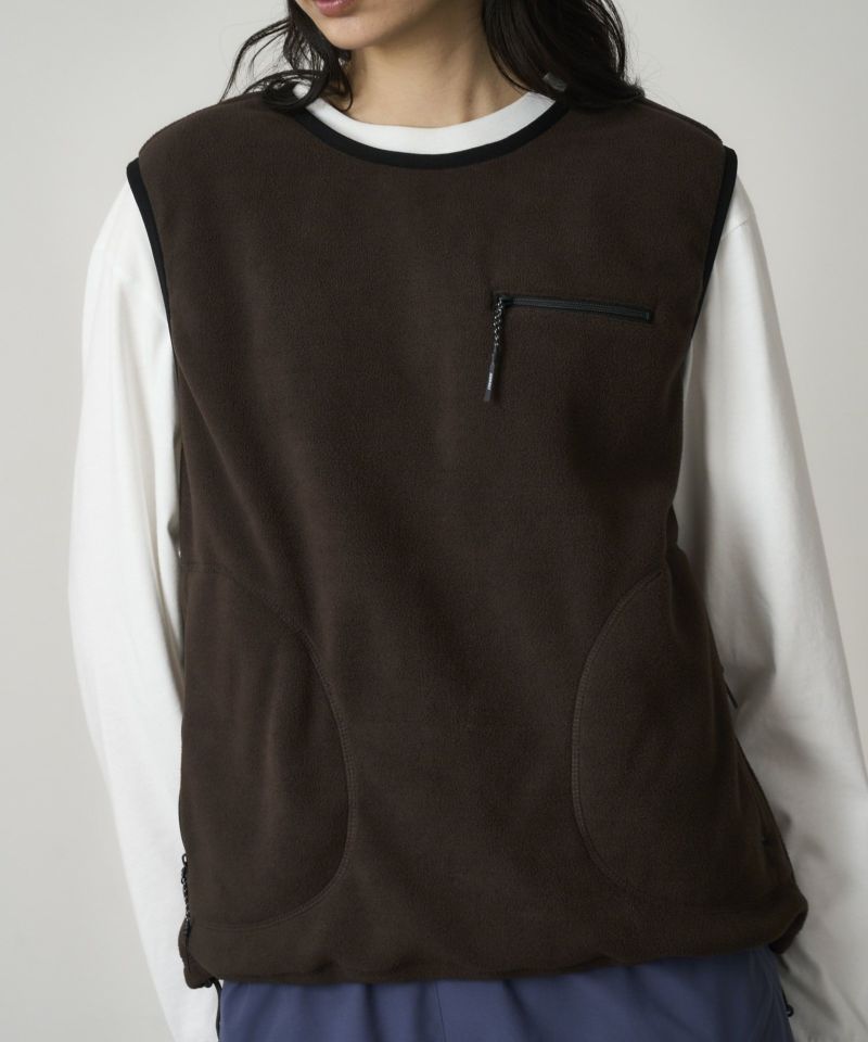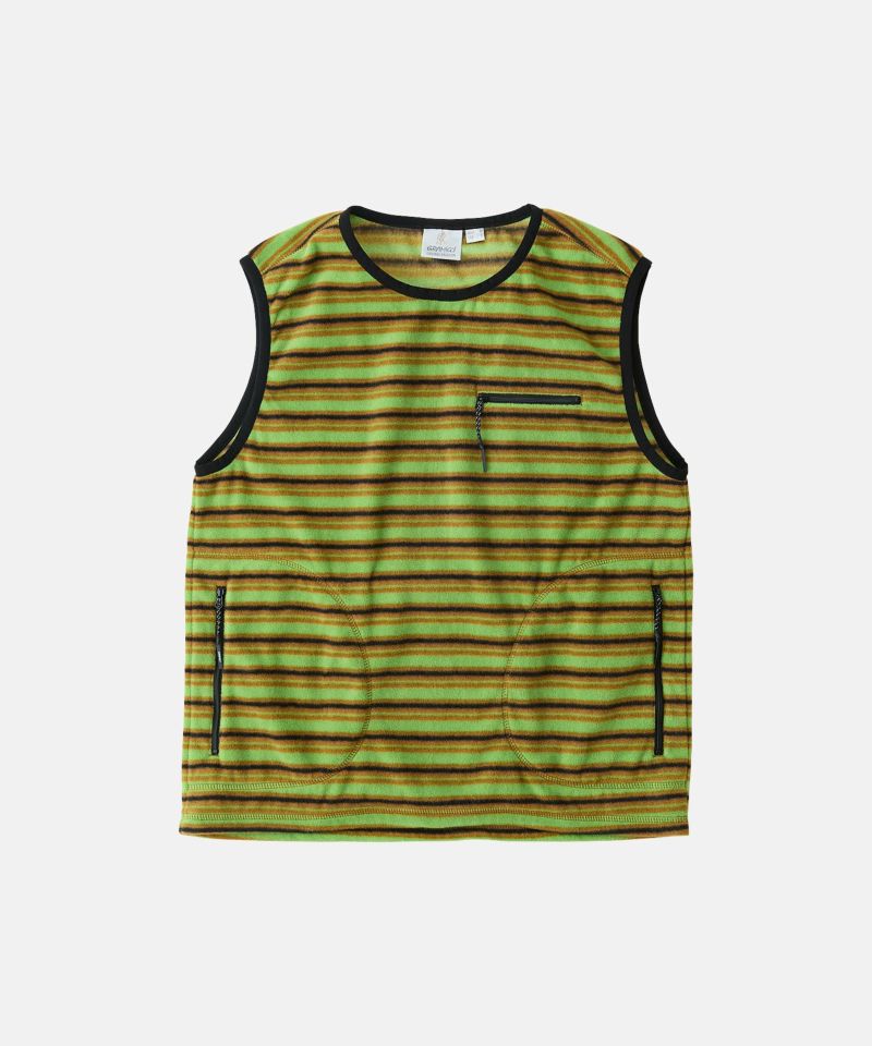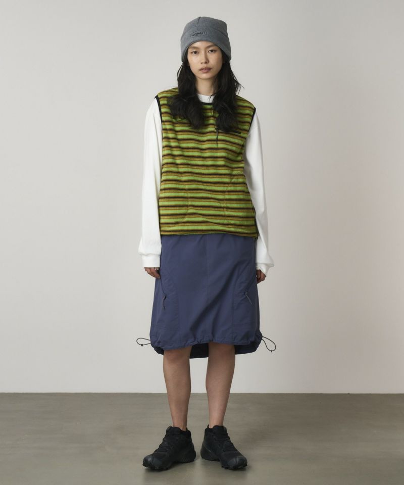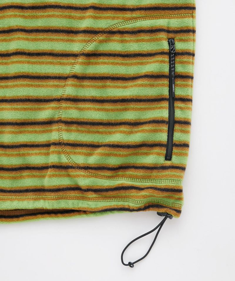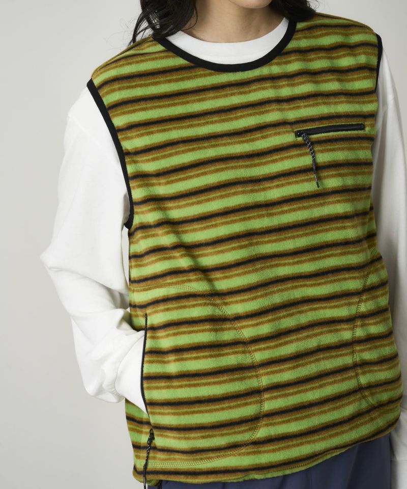 ジッパーポケットを3つ備えたプルオーバーのフリースベスト。裾はドローコード仕様で、シルエットや防風のアレンジが可能です。環境にやさしいリサイクルポリエステルによる、やや厚手で柔らかいフリース素材を使用し、軽く、暖かで、フレッシュで且つクラシックなボーダーはスタイルのアクセントにもなります。
