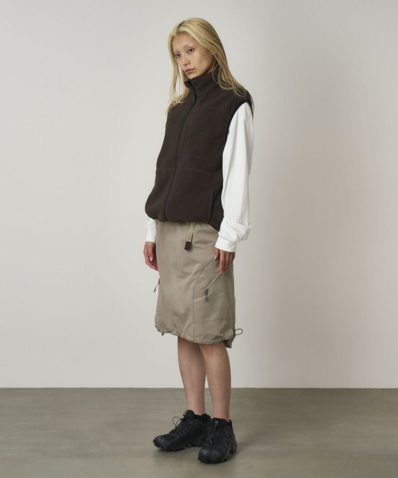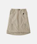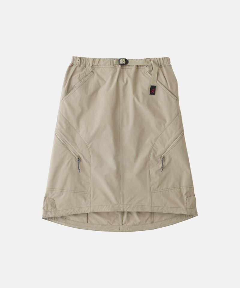 特殊なPTT繊維による、伸張回復力に優れたストレッチ性、コットンのような質感とドライな手触りが特徴的なリップストップによる、ラウンドしたテールカットの膝下丈スカートです。前後の切替えが特徴的な、両サイドに大容量のジッパーポケットを備えたギアスカートです。裾周りのドローコードでシルエットのアレンジも可能です。