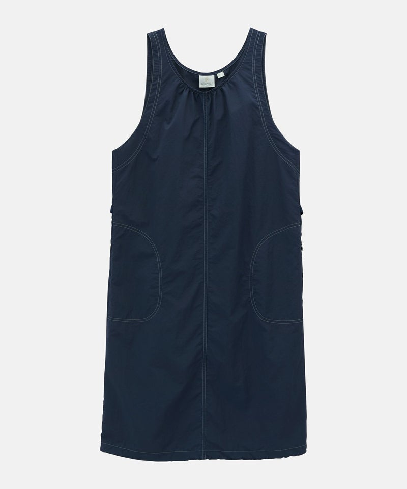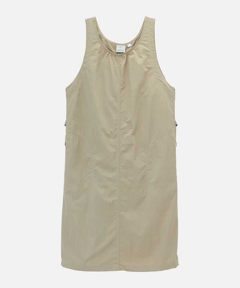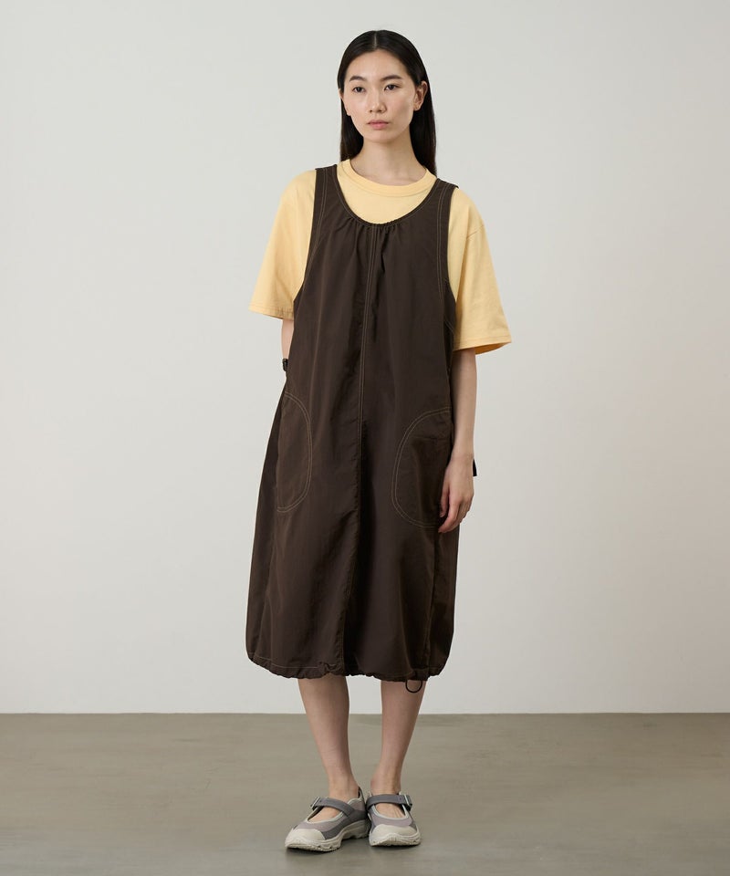 工場での廃棄対象であるナイロン糸クズや、ナイロンチップを回収し製糸された100%リサイクル素材である、ドライタッチと洗いを施したようなワッシャー感が特徴のGRAMICCI DURABLE NYLONを使用した、膝下丈のワンピースです。衿ぐりフロントのギャザーが入り、両脇のウェビングベルトでシルエットのアレンジが可能です。裾もドローコード仕様で、絞るとバルーンスタイルにもなります。撥水性に優れ乾きやすく、水辺でも活躍します。