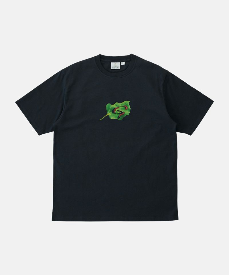 中厚手のドライタッチエココットンを使用した定番アイテム。夏はショーツと合わせて爽やかに、冬は重ね着のインナーとしても最適な、年間を通じて活躍する万能Tシャツ。シンプルでありながら、胸元に小さなグラフィック、背面には大きなグラフィックが印象的な一着です。