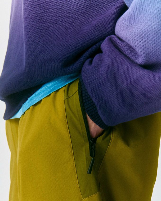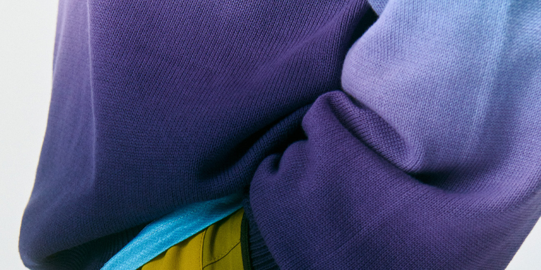 グラデーション染めによる色の変化が特徴的なサンフェードセーター。視線を引きつけながらも、過度に主張しすぎないトーンでまとめています。